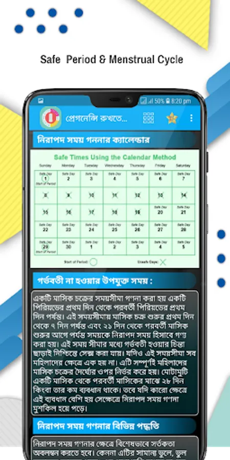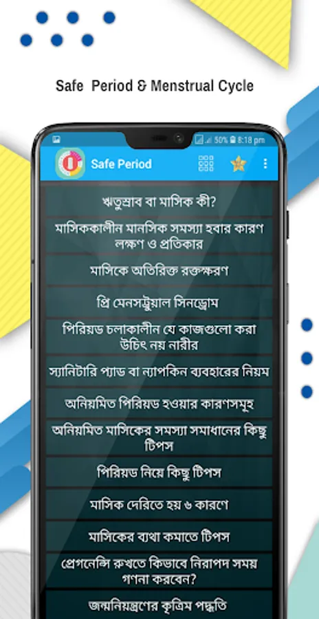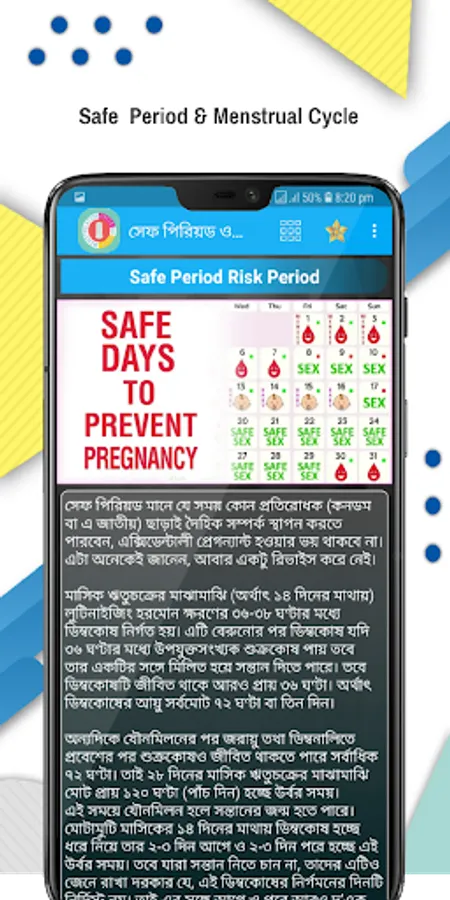 আপনি অনেক কিছু জানেন না আপনার ঋতুস্রাব বা মসিকের বিষয়ে কাউকে জিজ্ঞেস করতে ও লজ্জা পাচ্ছেন সমস্যা নেই আমাদের অ্যাপটি ব্যাবহার করুন ঋতুস্রাব সম্পর্কে সকল বিষয়ে বিস্তারিত জানতে পারবেন যাহা আপনাকে আপনার ব্যক্তিগত জীবনে অনেক সাহায্য করবে তাছাড়া আপনি যদি বিবাহিত মহিলা অথবা পুরুষ হোন আমাদের এ অ্যাপটি আপনাদের সেফ পিরিয়ড গননা করতে সহয়তা করবে ফলে আপনার জীবন হবে সুন্দর ও মধুর।