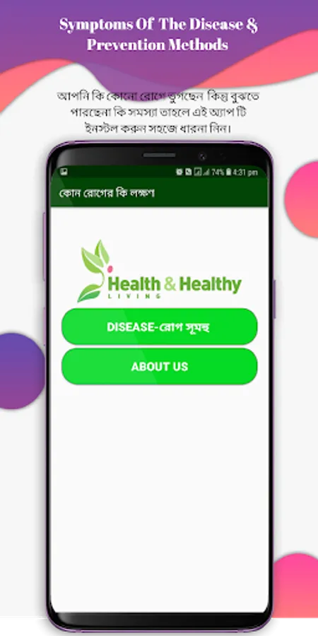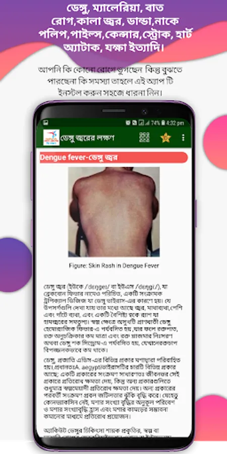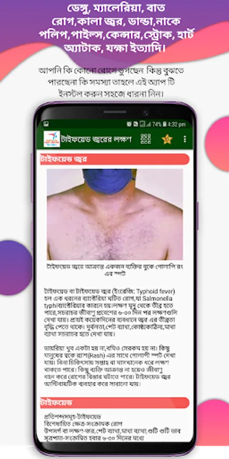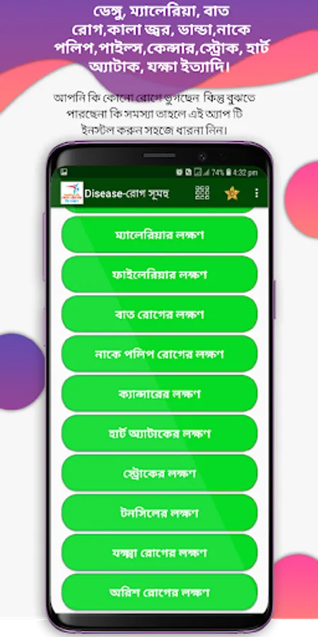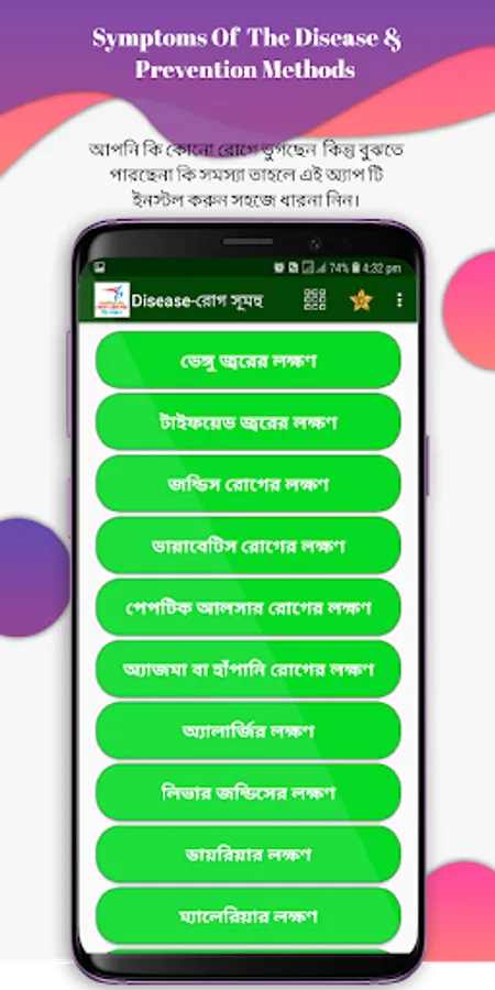 This is the first application ever in Bangla about All diseases symptoms, prevention & Treatment as you can say The application" Kon roger ki lokkhon - All Diseases symptoms " is helped you very much because if you acquired proper knowledge from this app you understand much about your own disease by symptoms then you make sure what types of disease suffered by you, so please stay with prayers & give your valuable compliment with 5★ Love & inspiration.