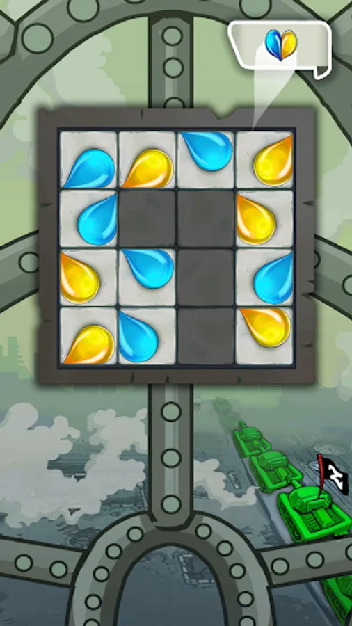 By moving the rows of drops, you can collect yellow and blue hearts. When you reach this goal, your heart will be credited to the progress bar. When you have collected all the hearts, you will complete the level.