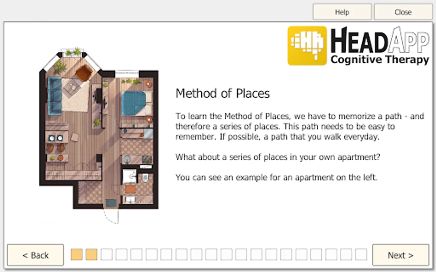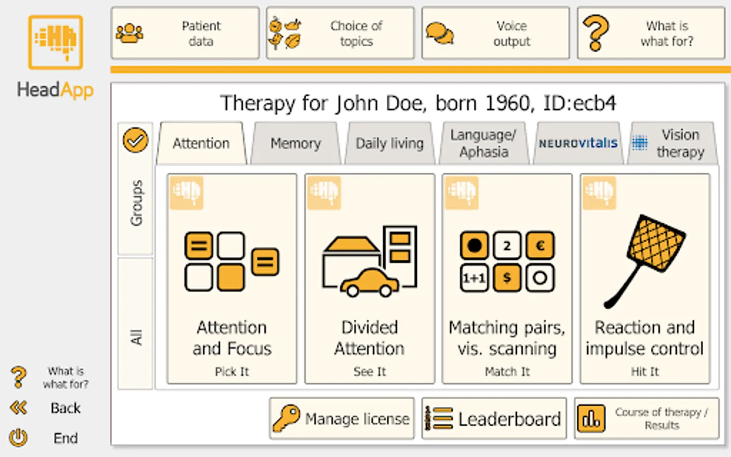 HeadApp/NEUROvitalis address the following cognitive domains: memory, working memory, attention, reaction and impulse control, planning and problem solving, spatial cognition, language and everyday functions. The app is a class I medical device developed by therapists and psychologists. The effectiveness of brain performance training (cognitive therapy) has been proven in many scientific studies.