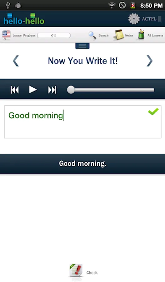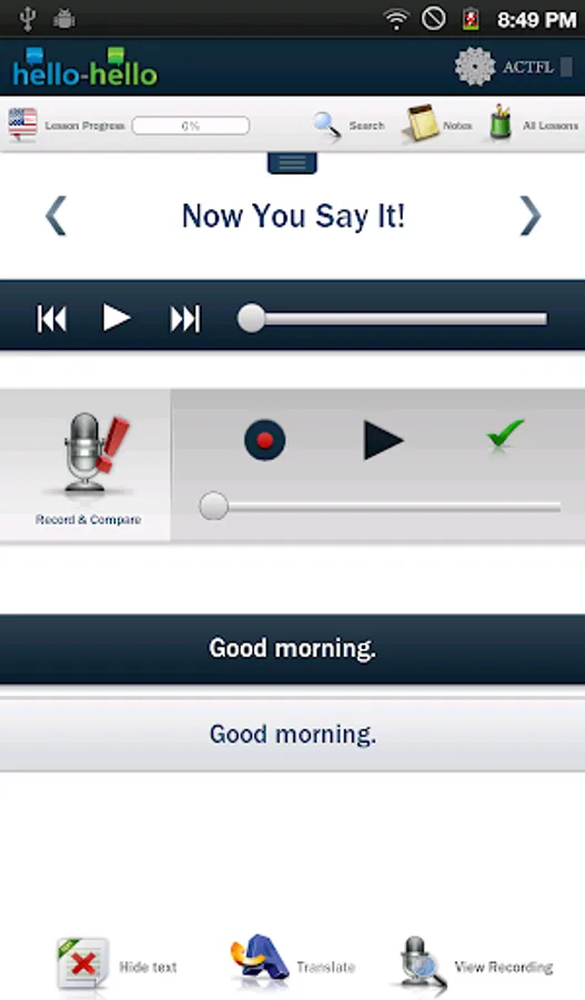 All the content is stored in the app so that you have great responsiveness when you are ready to learn a language. You do not need to be connected to Wi-Fi or 3G networks to run the app. With Hello-Hello English you will be able to do the lessons and practice vocabulary anytime, anywhere developing all the skills you need to communicate in a foreign language. All lessons were recorded by native speakers so you can learn the correct pronunciation.