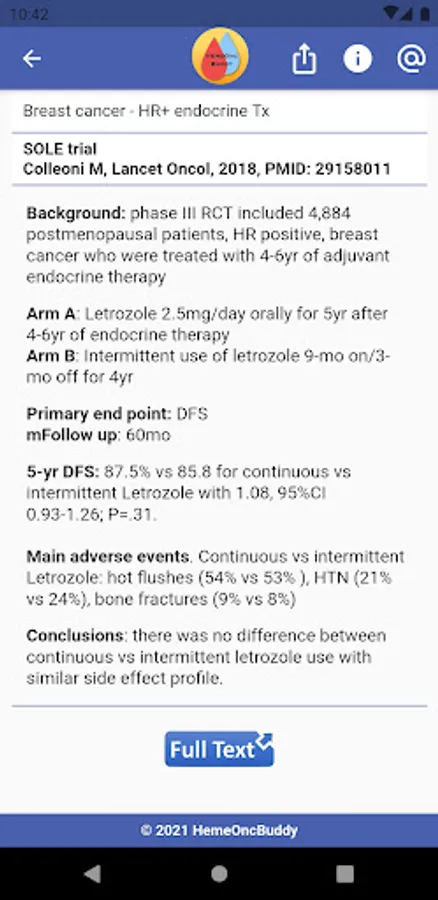 The goal of this app is to make clinical trial information easily available for quick reference. The trial summaries are organized in a unique simplified way to provide all the pertinent information on one page. Every trial summary includes background information with inclusion criteria for the population of interest. The exclusion criteria are included if the editor deems them to be important or different from other trials. Every unique summary has information on the primary endpoints, median follow up, and the outcomes on primary endpoints.