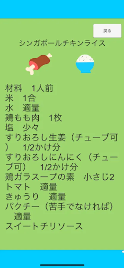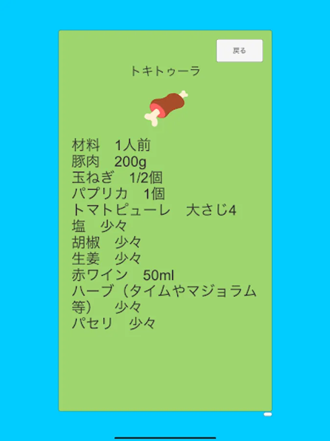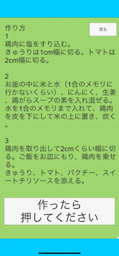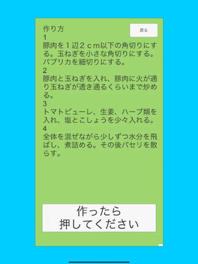 作ったことのある料理はプルダウンから選べるようになり、「作る」ボタンを押すとレシピを表示します。