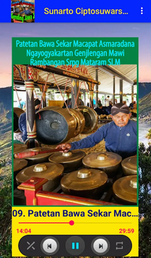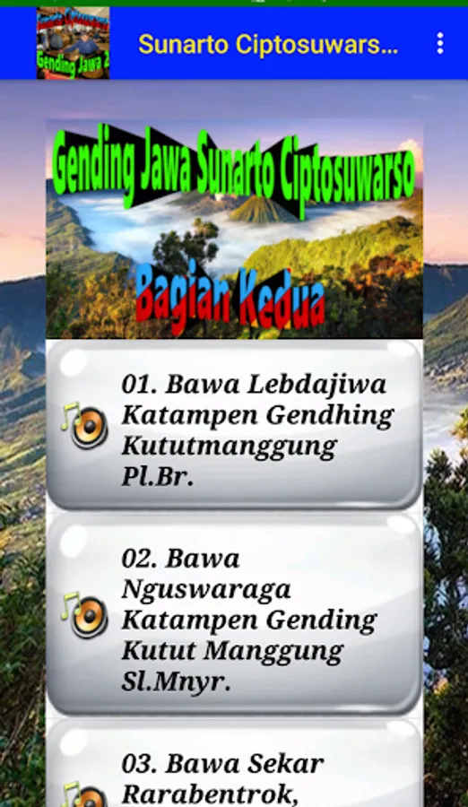 The Javanese Gending Song Sunarto Ciptosuwarso 2 is the second part of the Javanese gending song application which contains the best works of the legendary Javanese culturalist, Ki Sunarto Ciptosuwarso. Enjoy the beauty of the Javanese Gending music chorus with the melodious voice of Sinden-Sinden exposed to the land of Jawi. Enjoy the best Javanese Gending from Ki Sunarto Ciptosuwarso such as Peanut Flower, Turtledove Gending, Sl.Mnyr., Bring Sekar Rarabentrok, Katampen Gd. Gambirsawit Sl. 9, etc. Of course this application is very suitable for fans of classical Javanese culture, especially the art of music.