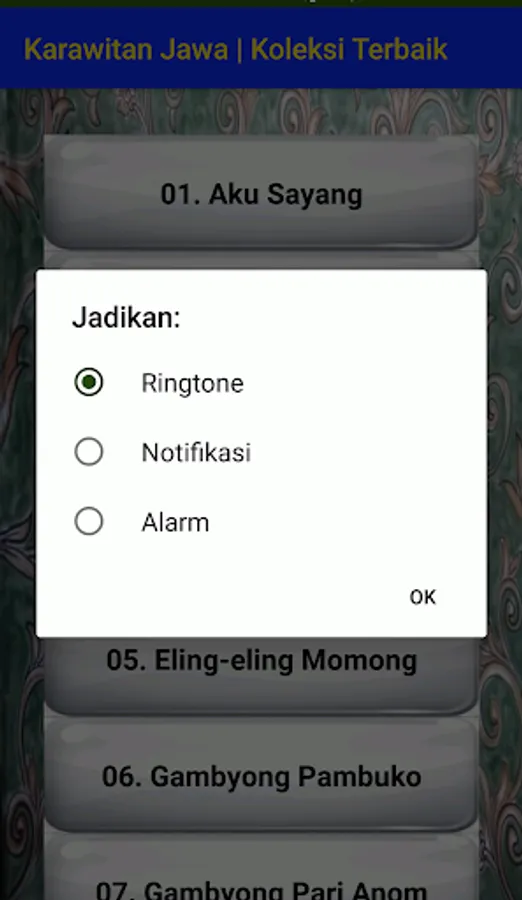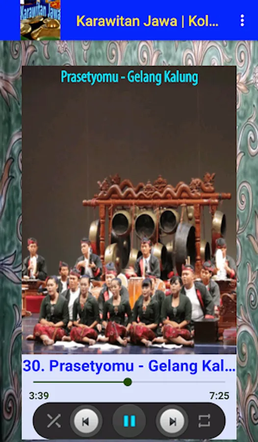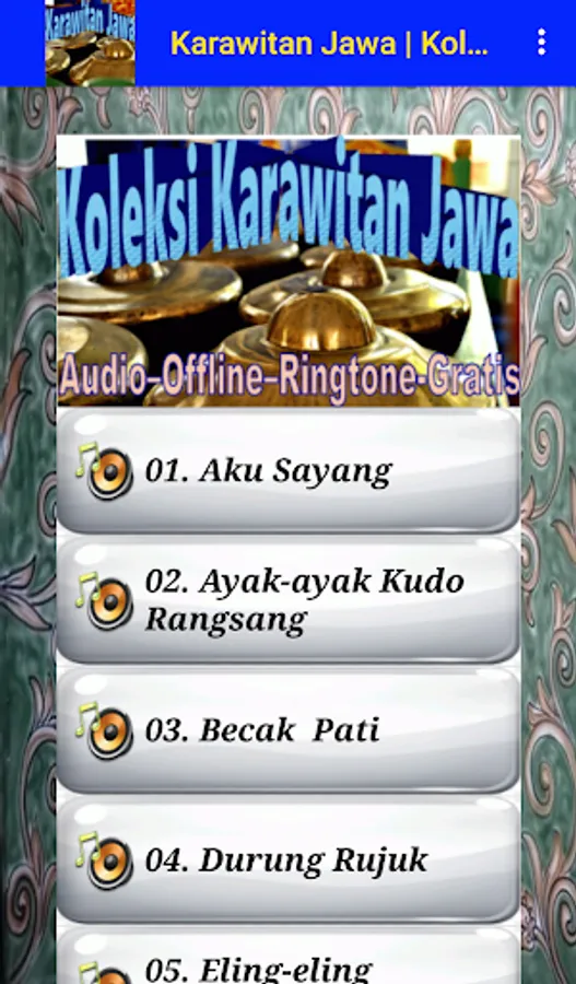 Enjoy the best collection of popular Javanese Karawitan songs and music such as Kembang Mawar Palaran, Eling-eling Momong, Mapak Waranggono, Pecel Lele, Ayak-ayak Kudo Rangsang, etc. This application is intended for fans of Javanese cultural arts, especially Javanese traditional music. Install and enjoy the authenticity of the art of Java Dwipa music. Enjoy the beautiful singing of famous Javanese sinden accompanied by traditional Javanese gamelan music.