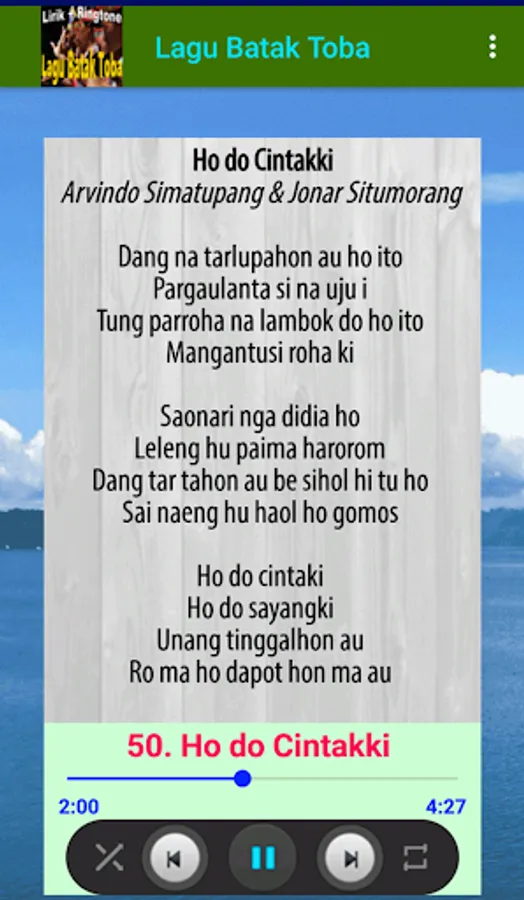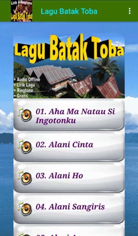 The application "Toba Batak Songs" contains Toba Batak language songs sung by famous Toba Batak singers. Download this Batak song application and enjoy the voice of the Batak singer who is famous for his singing of the most popular Batak Toba songs such as the Bolon Church, Dijou Ahu Mulak, Cintakki Holan Tu Ho, Boru Panggoaran, Aut Boi Nian, Alani Sangiris, etc.