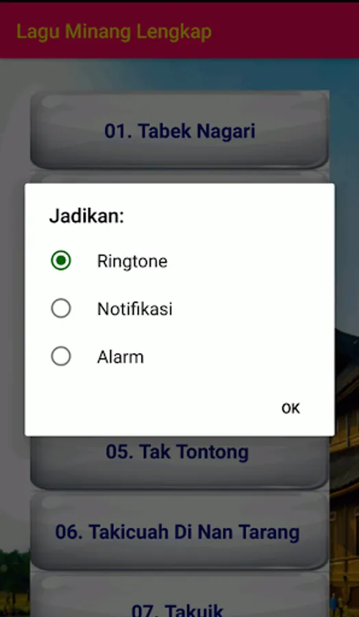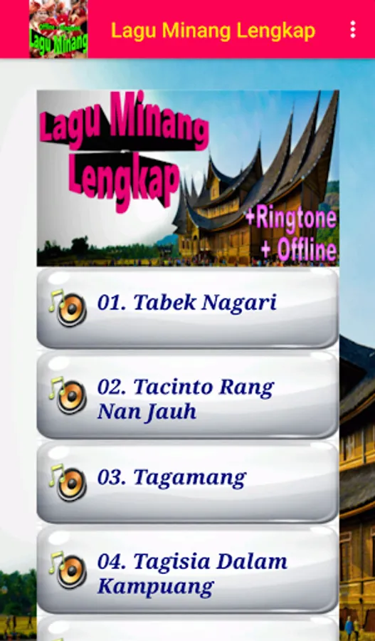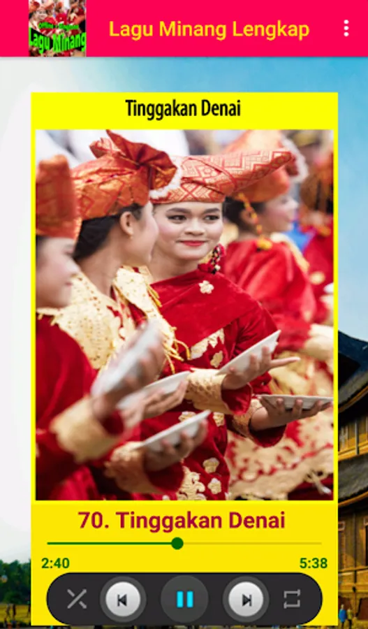Complete Minang Songs contains the best and most complete collection of songs from the Minang realm such as Takicuah Di Nan Tarang, Talambek Maminang, Talanjua Sayang, Add Pitih Balanjo, Tapauik Di Rantau, Tasisiah Di Nagari, etc. An application for those of you fans of the art of Padang regional music. Please install and enjoy Minangkabau songs directly on your cellphone. All songs can still be enjoyed even without the internet. Also each song can be used as Ringtone, Alarm, and notification.