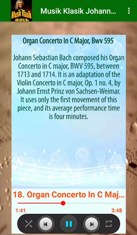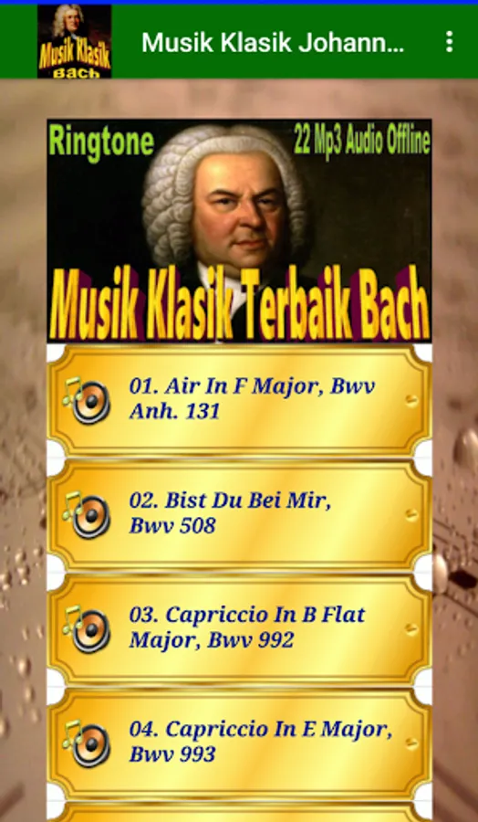 Enjoy the best collection of Classical Music from composer Johann Sebastian Bach. This application consists of 22 offline audio of Johann Sebastian Bach's best works such as Bist Du Bei Mir, Bwv 508, Gott Fähret Auf Mit Jauchzen, Bwv 43, Neumeister Chorales, Bwv 1090-1120, Passacaglia In C Minor, Bwv 582, etc. Install and enjoy the best benefits of listening to classical music. It is appropriate to be listened to for the development and goodness of the soul, especially for pregnant women, infants, children, etc.