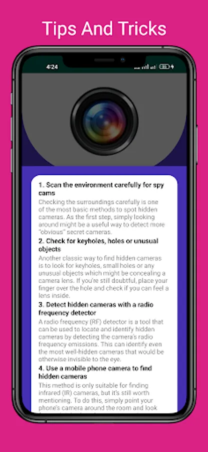 Hidden Camera Detector Spy Camera Detector πΈis a very useful app for your family privacy if you visit another city and stay in a flat or hotel some honors are placed in hidden camera detector and spy camera detector if you wish your family privacy are secured you must use this hidden camera detector app is best for your family privacy. firstly install the spy camera detector app and click on the camera detector button and move the phone in your room this hidden camera detector app detects all types of hidden devices in your room. when your phone is found spy camera your phone starts β° beeping.