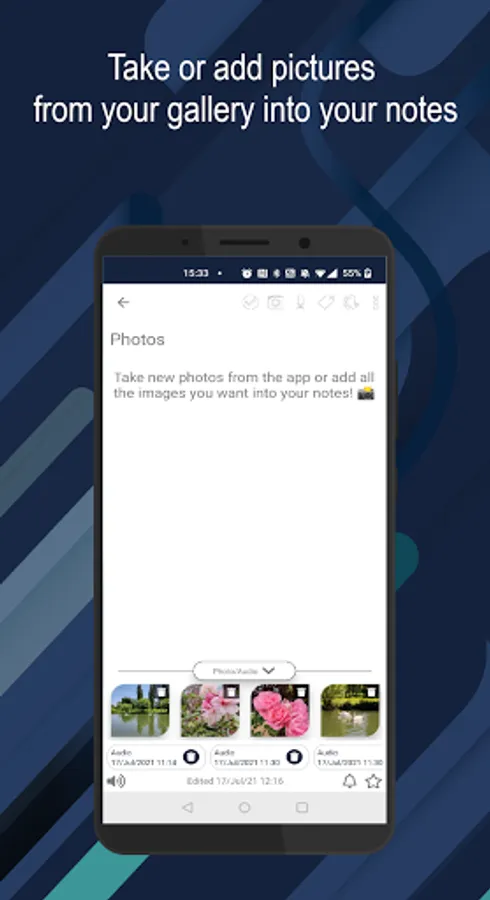 You can use Safe Notes as a digital notebook or diary and add pictures, taking them with camera or your gallery. You can keep notes of lectures, business meetings and interviews or if you need quickly transfer URLs, code snippets and email addresses.