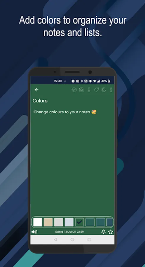 * Colours. Use colours to categorise notes by importance, tags or subject or just make your notepad more fun.