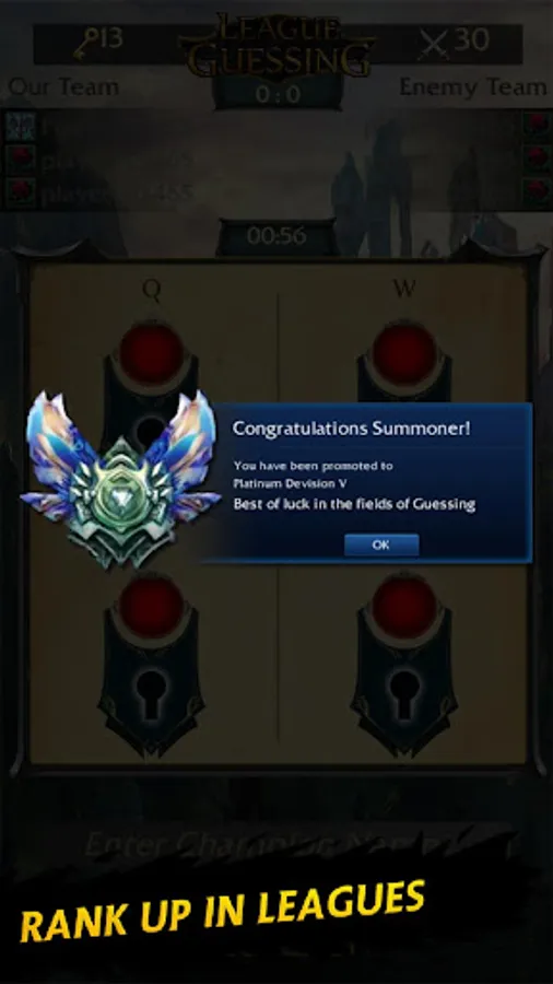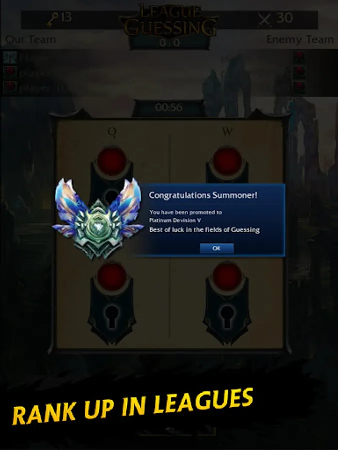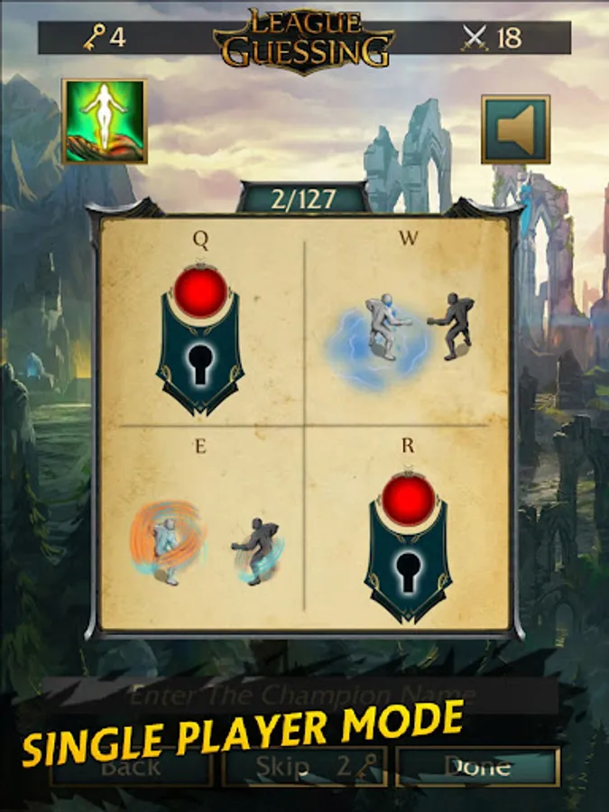 The game has one mode, a single-player mode where the player gain IP for guessing Champions, IP can be changed for keys. Each Champion starts with 1 unlocked skill. You can unlock the other 3 skills with keys. There are daily key prizes and free keys on our Facebook page, so stay tuned! You also obtain free keys anytime by watching an ad.