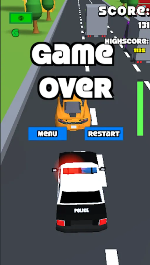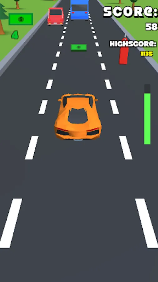 You can choose from two game modes. The first game mode has three lanes with heavy traffic that you must avoid. You must tap on the right or left side of the screen to switch lanes. You can collect cash along the way which you can use to unlock new cars. You can also collect fuel to extend your race time. Longer you drive without collision, the more points you collect and reach a new high score.