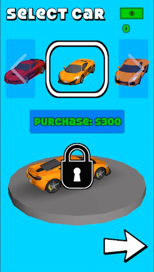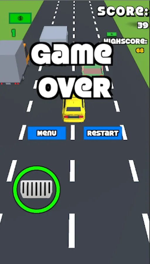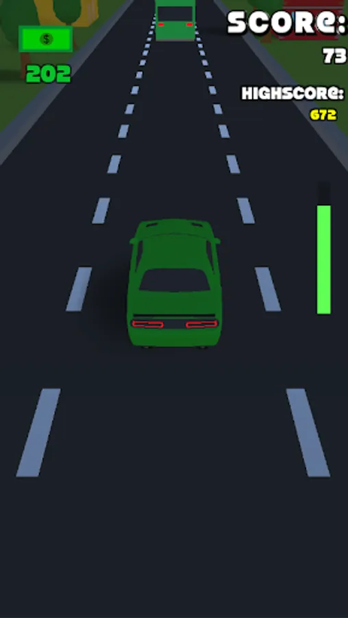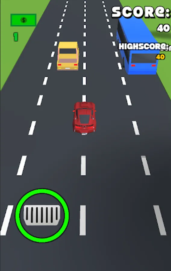 The second game mode has four lanes with randomized traffic in front of you. You must avoid touching the vehicles at all costs. Your car in this game mode is controlled by tilting your phone left and right. You also have a brake which you can use to reduce speed and avoid collisions, but you must use it wisely. The brake has a limit on how much you can use it, and if you use it too much, it will run out. The brake will regenerate over time. You can cash along the way to purchase new cars. Survive as long as possible to reach a high score.