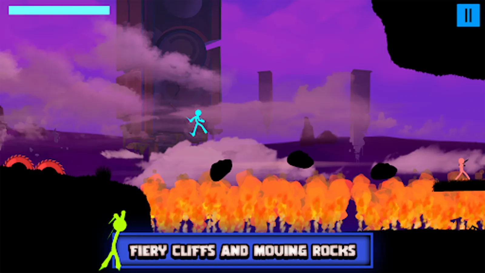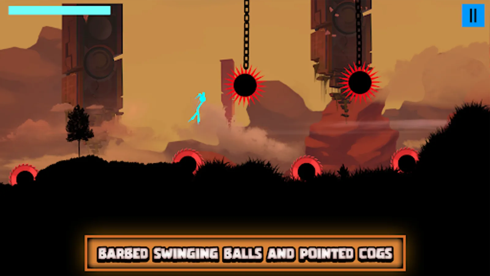 In the game, there are 40 chapters. There are challenging obstacles in each section. There are many obstacles waiting for you, such as a prickly ball swinging in the sky, pointed metals suddenly rising from the ground, spears thrown at it, deadly cliffs, rocks moving on the cliff, falling lightning bolts, spinning wheels. Shoot at the chain of swinging balls with your gun. Because of the broken chain, the barbed ball will fall down. At the same time, if there is an enemy stickman under the ball, you will have shot two birds with one stone. Congratulations, you killed your enemy without having to shoot. You have to move as nimbly as possible to escape from the spears thrown at you. One right and one left, and here you are saved! When you are on moving rocks, the point you need to pay attention to is to find the balance. The rocks will fall to the ground shortly after you step on them. Hurry up and keep your balance and make your next move. Jump as you go through the rotating wheels. Do not get your arm and leg caught in the wheels while jumping. Didn't we say the obstacles were difficult?