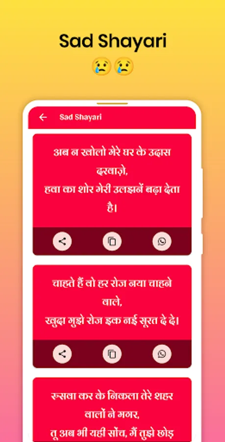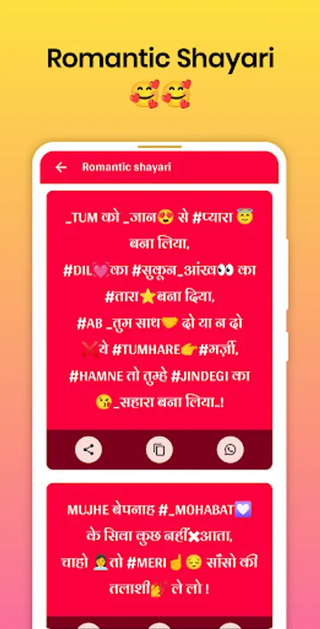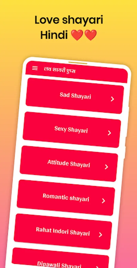 Special features of app: Some of the featured sections of this app are: Love Shayari in Hindi, Love Shayari in Hindi for girlfriend, Shayari love in english, Best shayri for Love, Love Shayari in Hindi Text, Best Shayari, New Shayari, Shayari in English, Love shayari in Urdu, Best Shayari in Hindi, Shayari Status, New Hindi Shayari