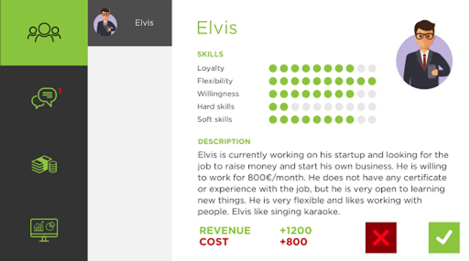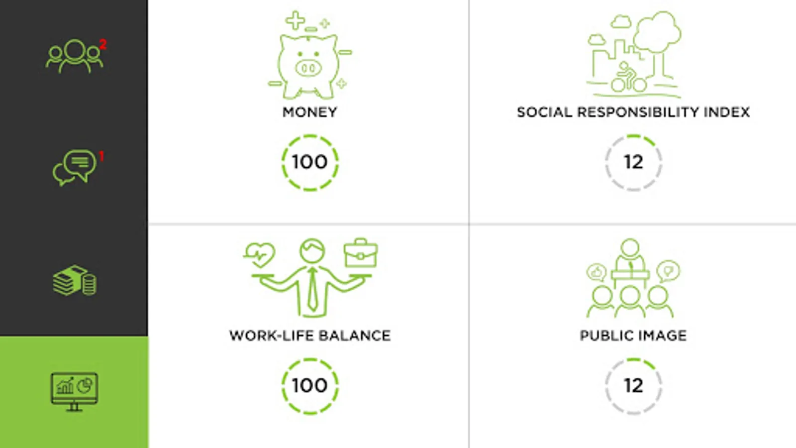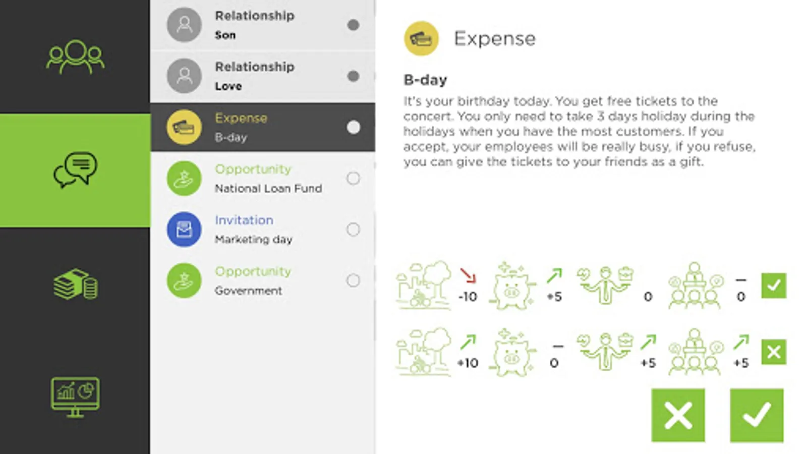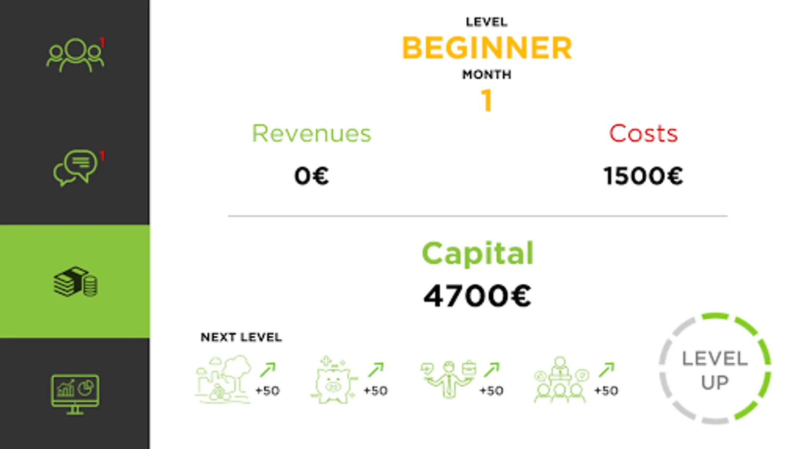 In L€ARN, you start your own business. Gradually, you receive messages that you need to solve. You get opportunities, market news, invitations, family SMS, as well as invoices and items that you have to pay for. Your behavior is influencing the four indexes that make up your score. In addition, you need to make sure that you can increase your earnings by expanding your business and employing employees to equip your business or take advantage of market opportunities. How you manage your business is up to you. You test for yourself what it's like to own a business and strive for its success.