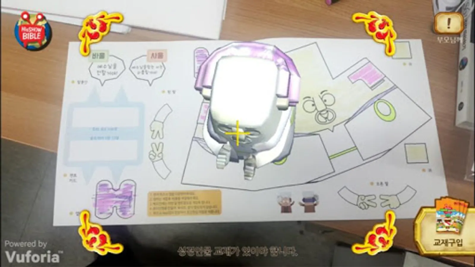 교재의 종이인형 만들기를 색연필로 색칠하고 앱을 통해 카메라로 비추면 아이들이 색칠한 모습 그대로 성경인물이 살아납니다.