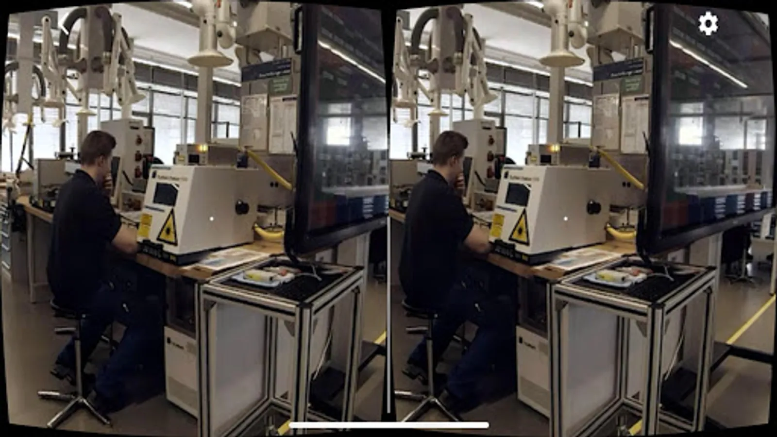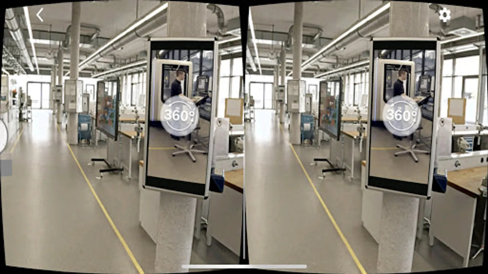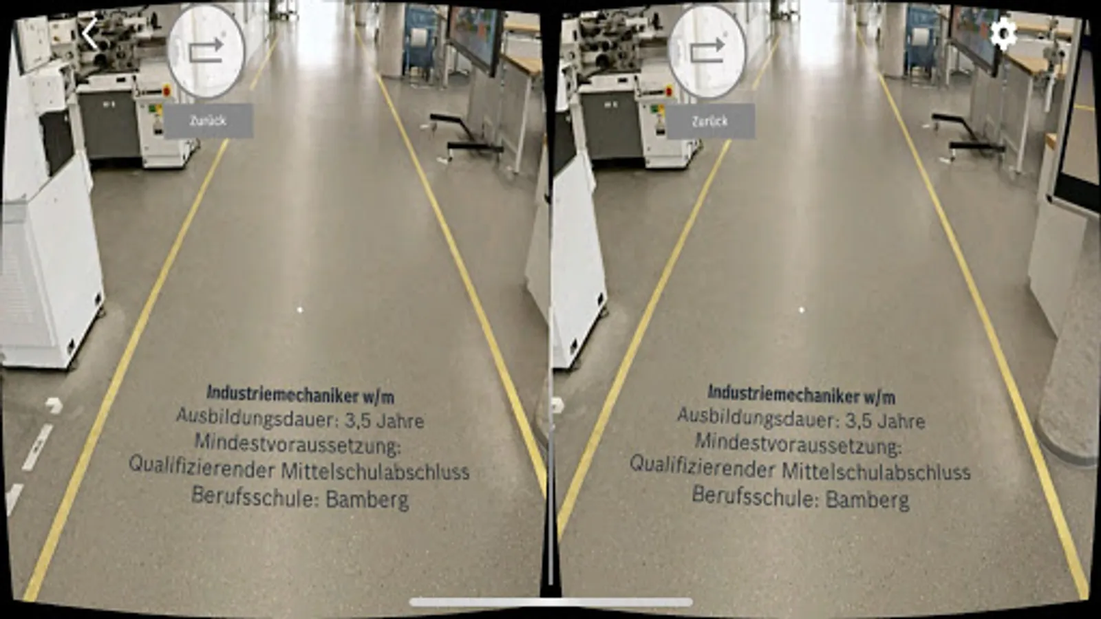 With our App AzubiVR we give young professionals an innovative and interactive insight into various apprenticeships. To start, you simply have to place the smartphone in a VR holder (cardboard). Then you enter a virtual training world. The white dot in the middle of the screen serves as a cursor. As soon as you hold it on an action area (e.g. door to the next room), the bar fills up. When it is fully loaded, the action is triggered (e.g. entering a room). From the foyer, where you can watch two 2D films, you can access four other rooms. Here you can look at the specific professional environment from a 360-degree perspective. You can also watch four 360-degree films covering a total of four apprenticeships. To leave the film sequences or to return to the foyer, you simply have to look down until a "Back" button appears. With our app, we would like to support trainees in their choice of training. The VR experience helps to present the professions more clearly and to address them to young users in a way that interests and fascinates them.