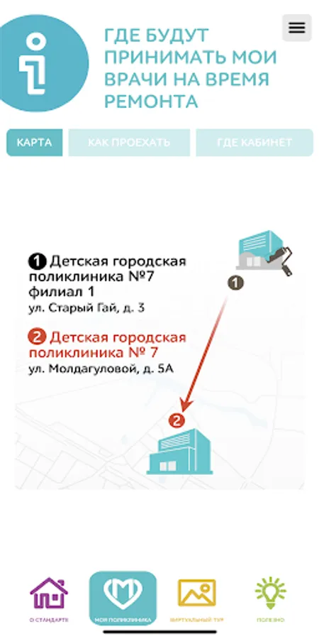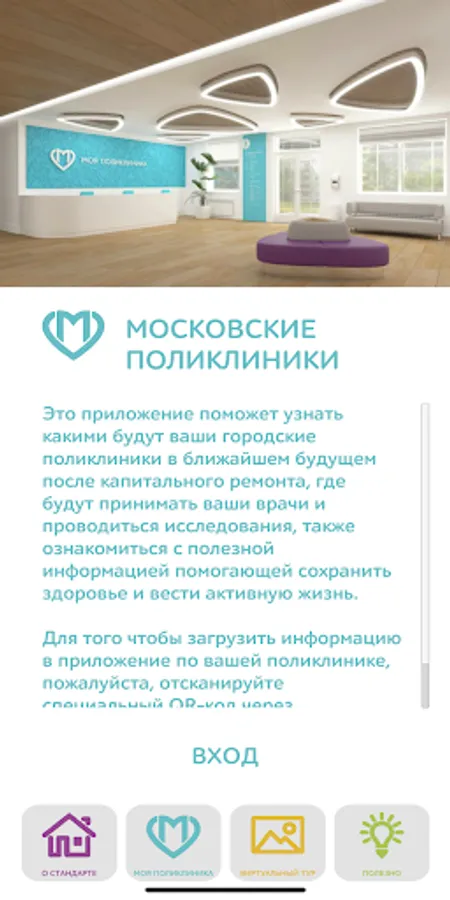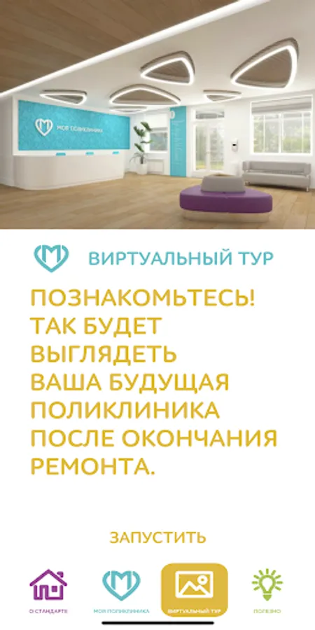 The application will allow you to take a virtual walk through your refurbished clinic and see new approaches to medical care in the healthcare sector, performed according to the Moscow standard of polyclinics +.