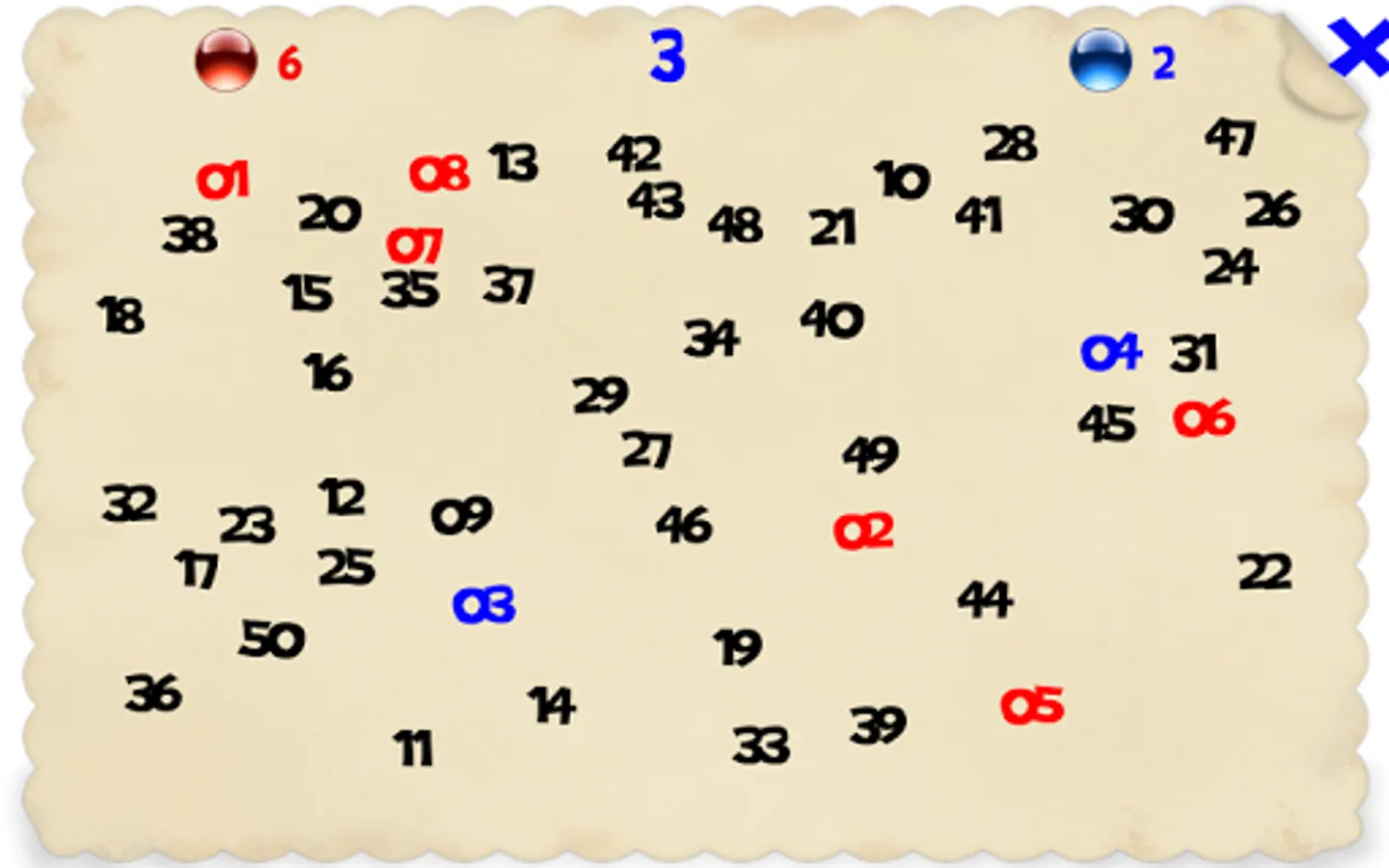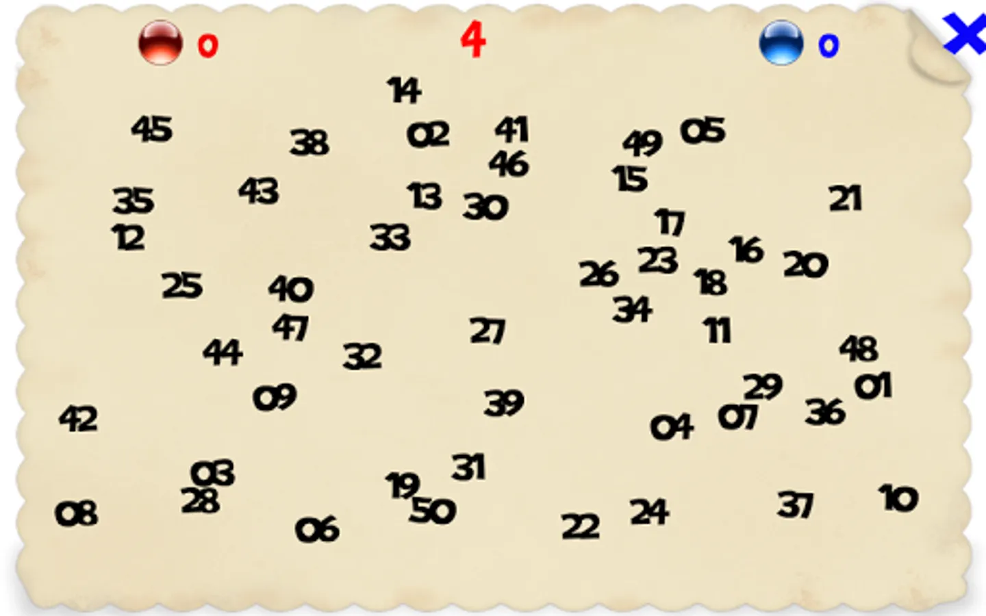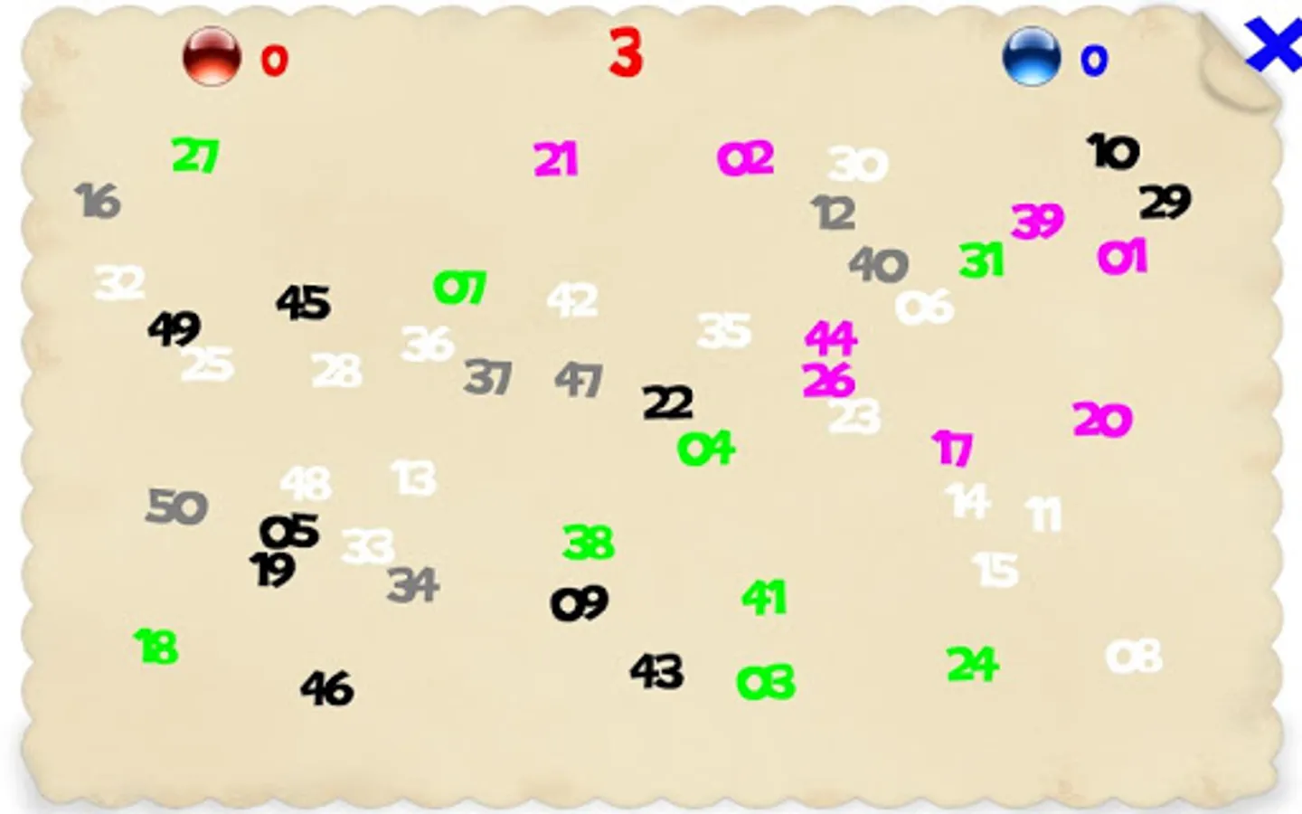In game you must use your eyes and hand as quick as you can to find all numbers from 1 to 50 or 100 or 150. Have 2 mode for your choice : single or VS (play with your friend):