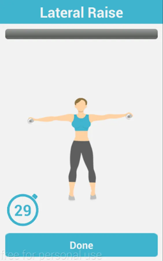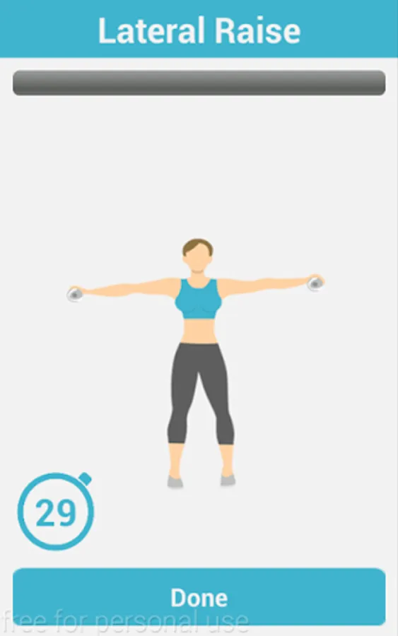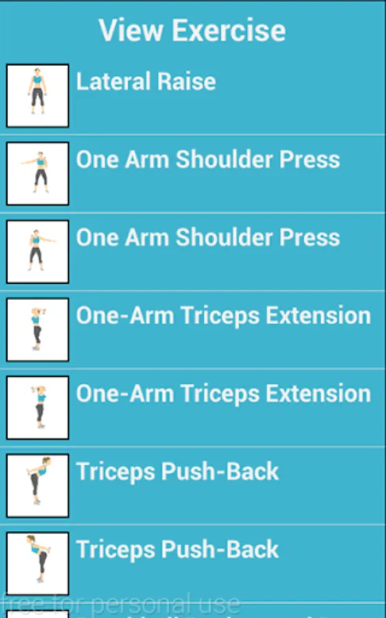 Women's Arm Exercises app combines many exercises: Lateral Raise , One Arm Shoulder Press, One-Arm Triceps Extension, Triceps Push-Back, Dumbbell Pushup and Row, Full Plank.