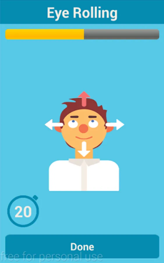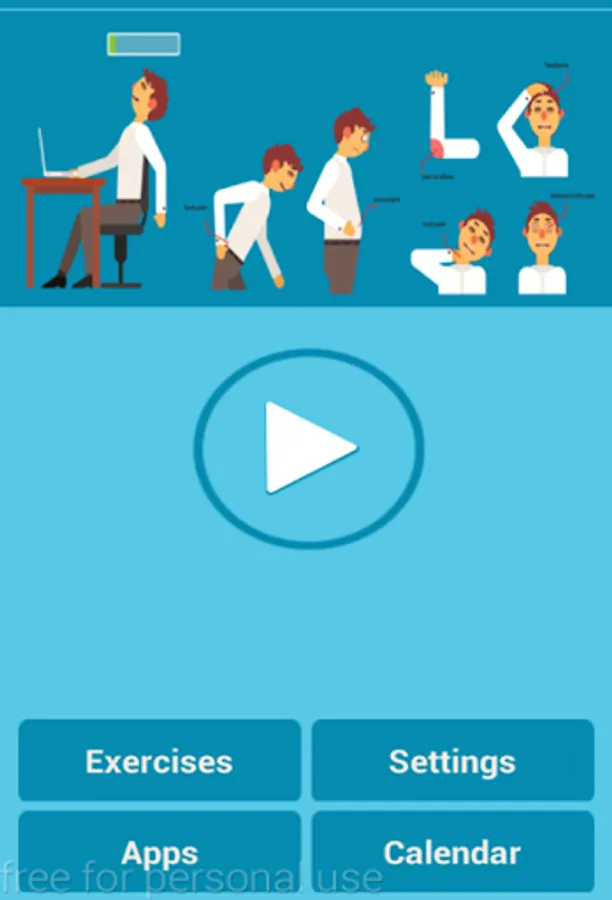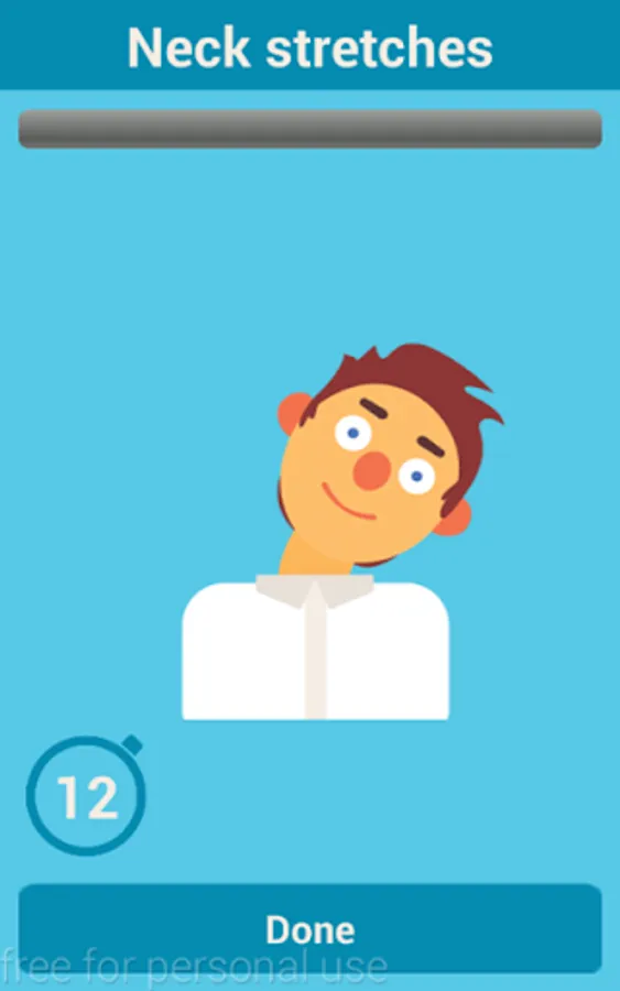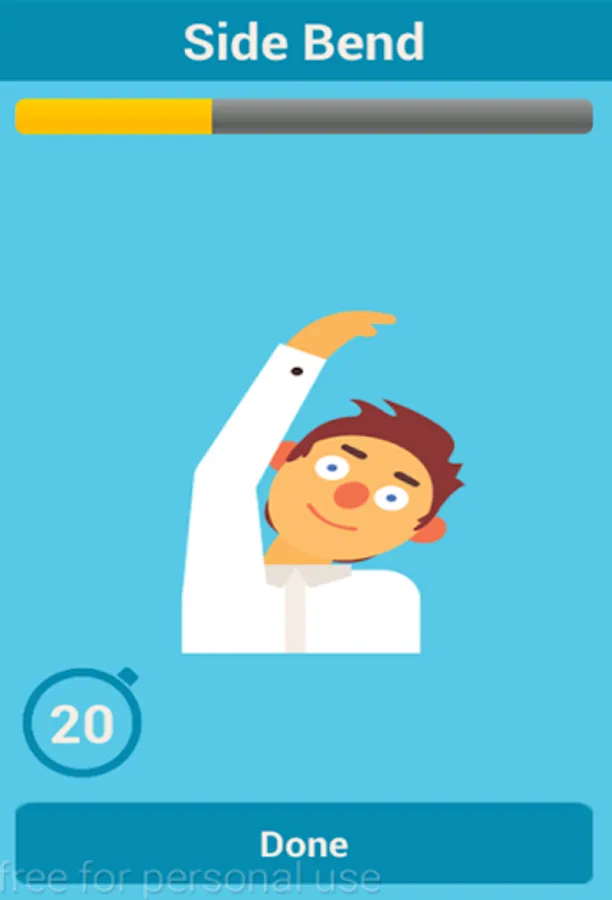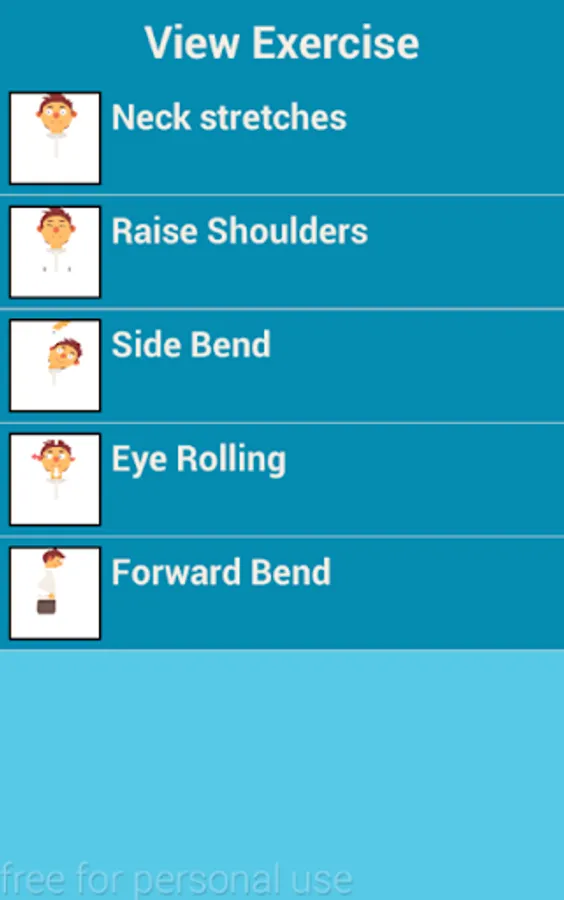5 Quick Office Exercises app combines 5 exercises: Neck stretches, Raise Shoulders, Side Bend, Eye Rolling, Forward Bend.