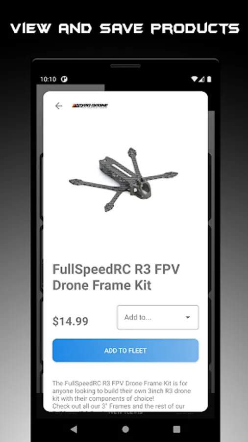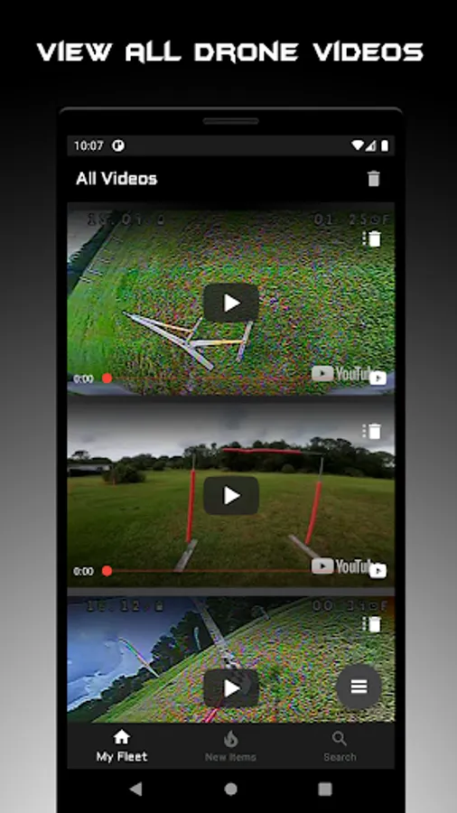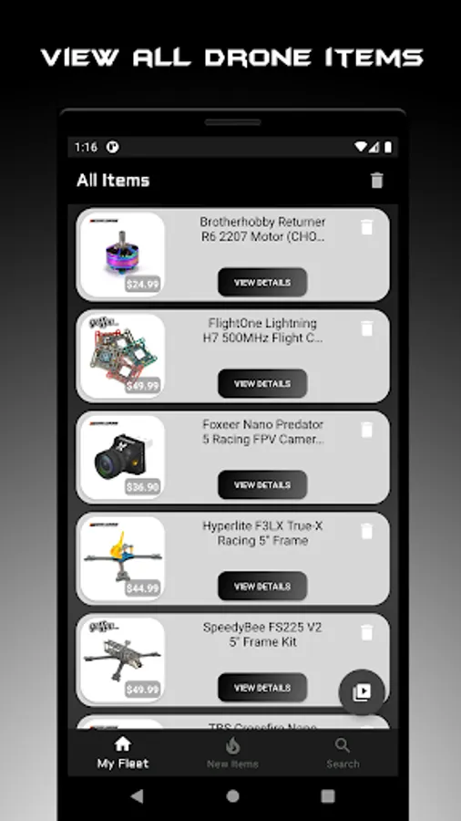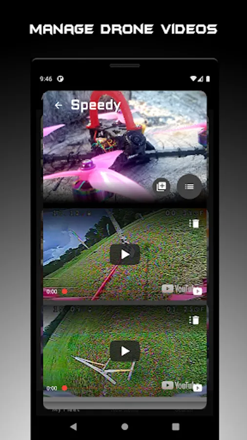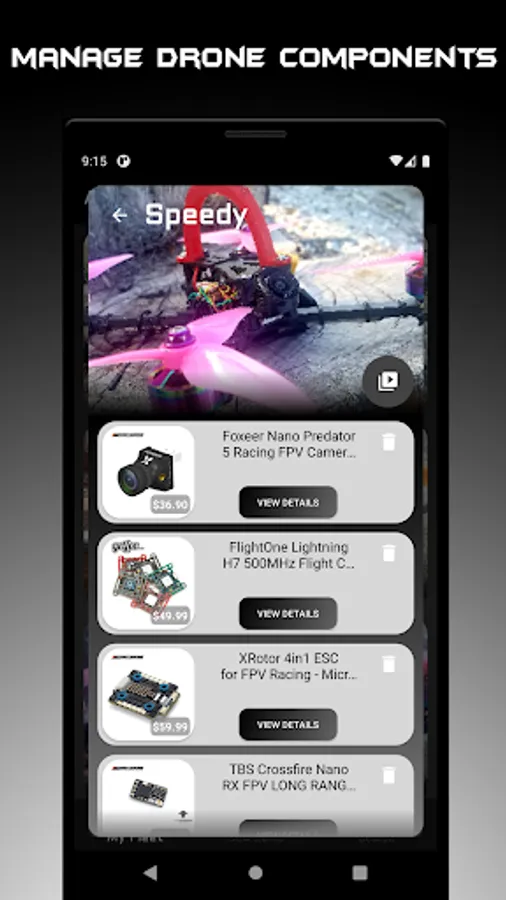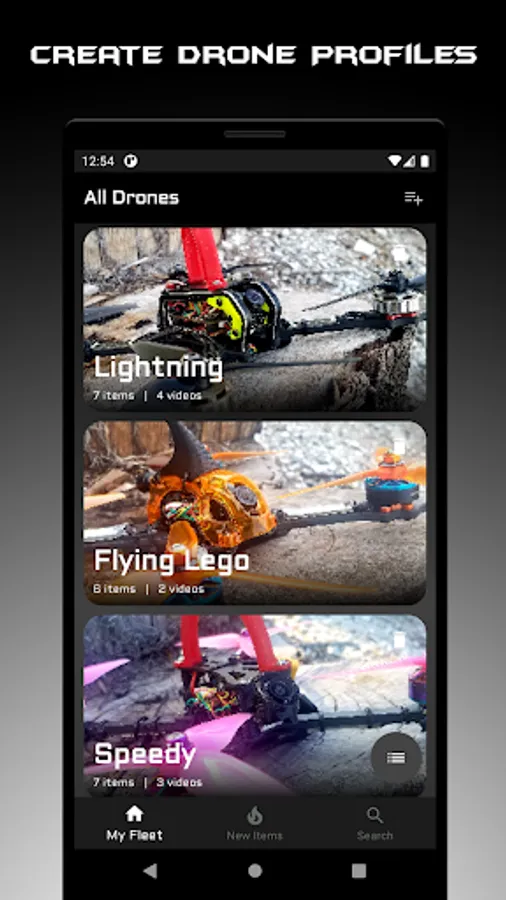 Manage your fleet with drone profiles by adding components for simple management or reordering of parts when you break something at a race or on a new freestyle trick. YouTube videos of your favorite race DVR or freestyle clips can also be added to a drone profile for easy, organized viewing of each drone in your fleet.