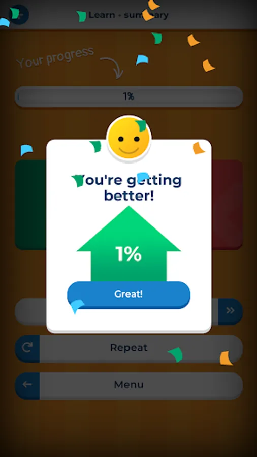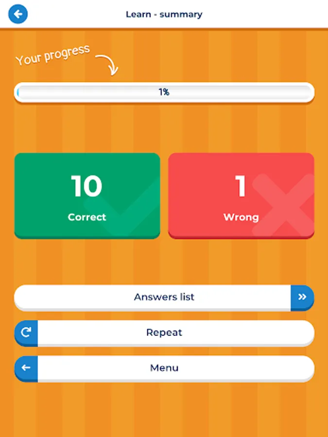 * Learning progress bar. You will see how great you're doing and learn what requires further repetition.