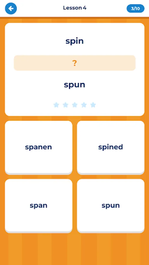 * Learning – any number of lessons that will help you learn all irregular verbs. Each of them is adjusted to your current knowledge and learning pace. Thanks to this, you avoid repeating things you already know, focusing on learning new words instead.
