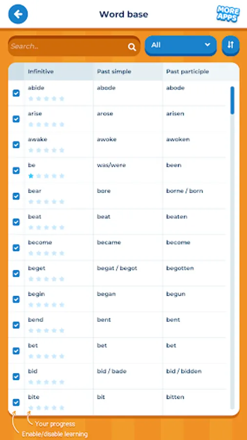 * Word base – thanks to which you will get quick access to all irregular verbs. Check learning progress for every word. Every verb can be included or excluded from the learning progress.