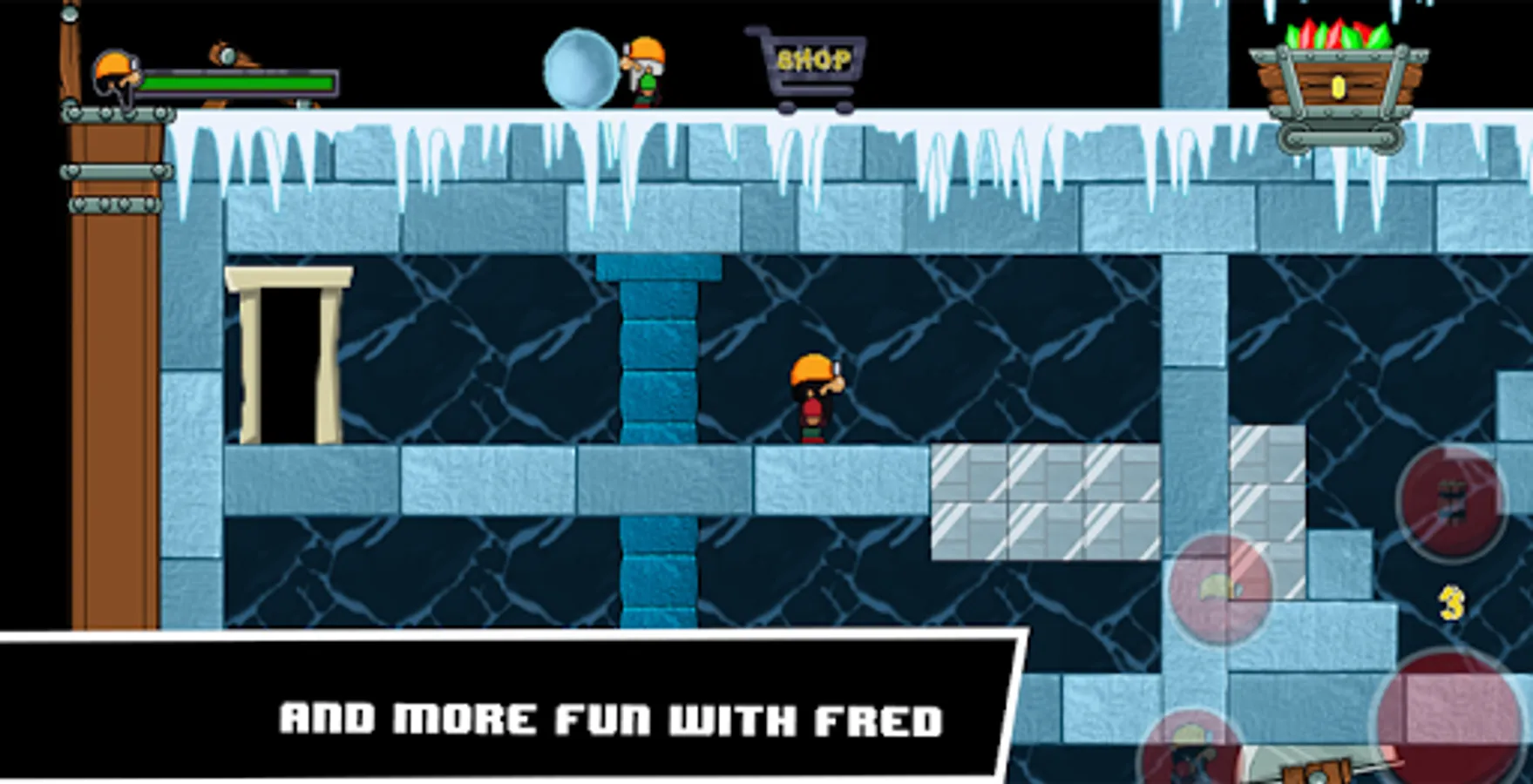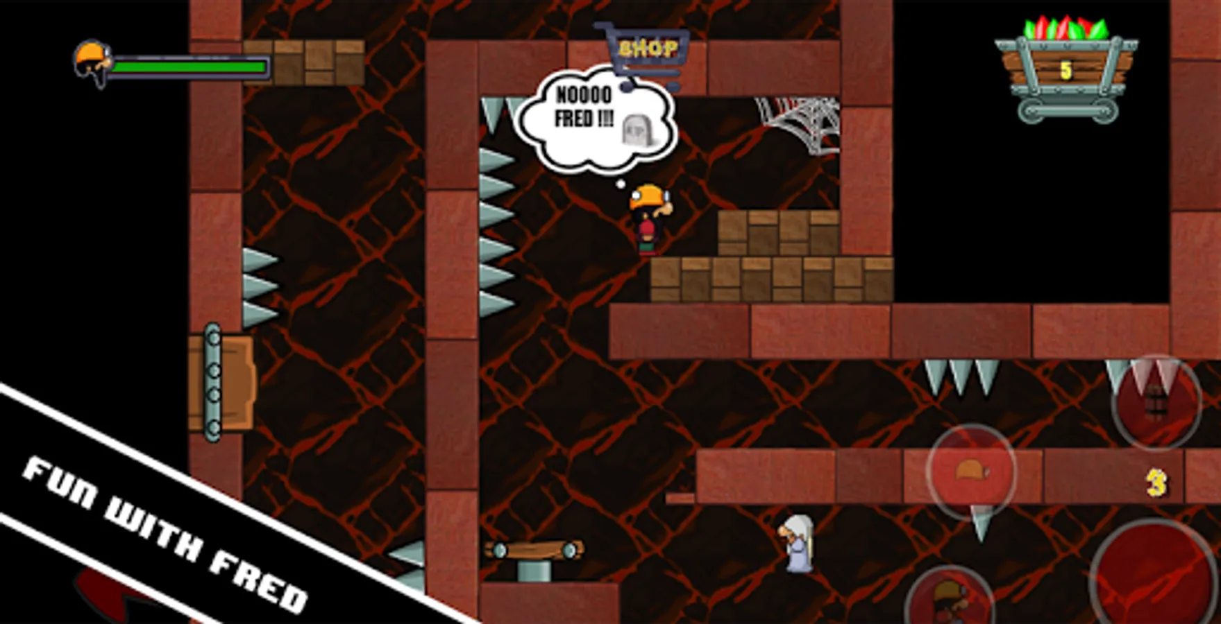 Dan is unfortunately not alone, he has his friends with him, their name is Fred and the "FREDS" always cause trouble, but help * DAN * in some situations. Dan the Dungeon Digger has to fight his way through the different levels and always finds secrets or treasures, which he can improve in the shop with better jackhammers or even buys explosives, so that it is faster to eliminate some enemies or stones. Many traps, enemies and bosses are waiting for you, but also funny things with the "FREDS" that will annoy you again and again or want to help you.