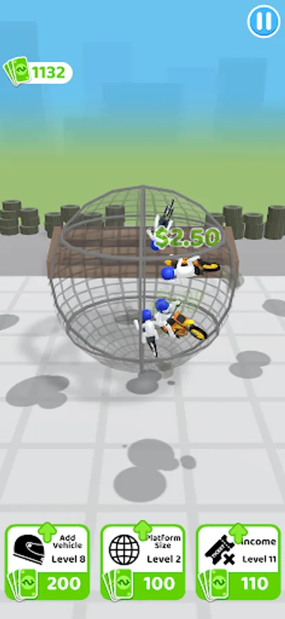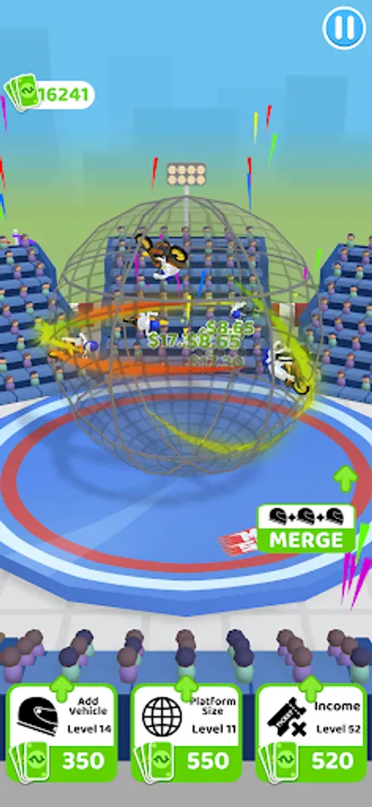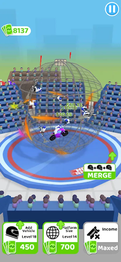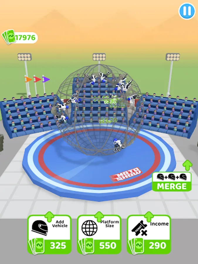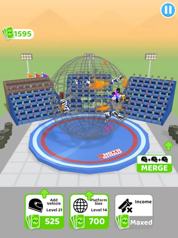 It's time to put on a huge motor show! Tap, earn and grow! Make your Cage bigger, merge your Motorcycles and grow the audience!