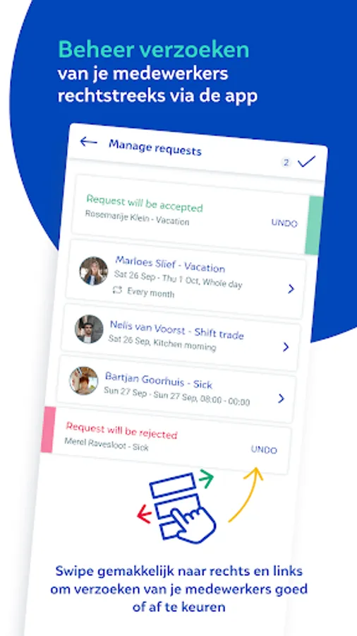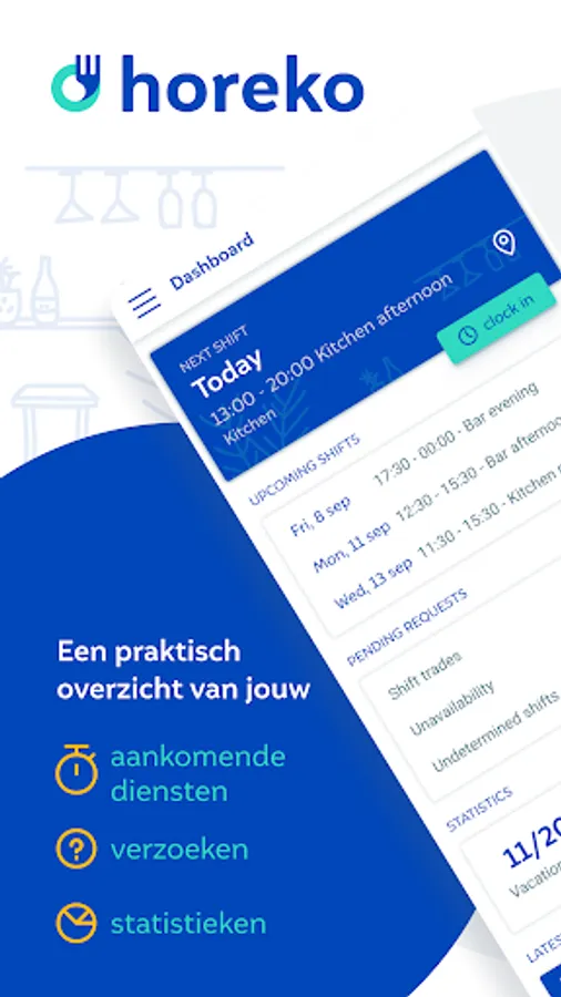 With the Horeko app you have your agenda in your pocket. With our app you can easily communicate with your manager about your available days and leave requests, you can see all your worked hours in your personal dashboard and you can easily swipe through your shift requests.
