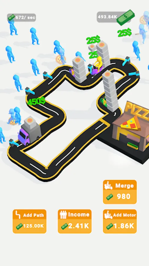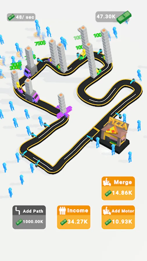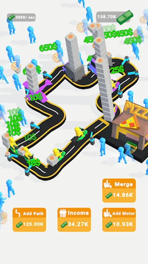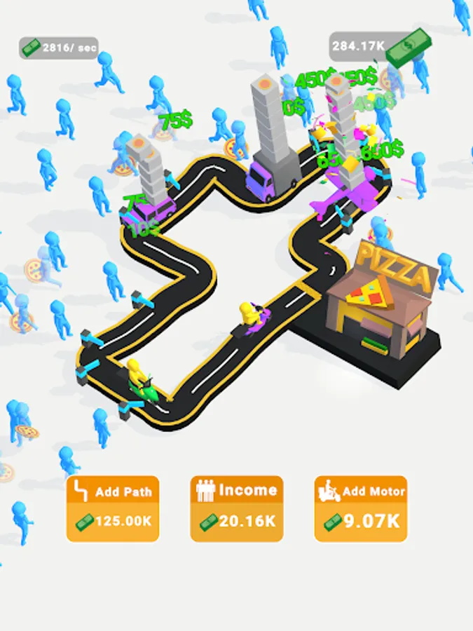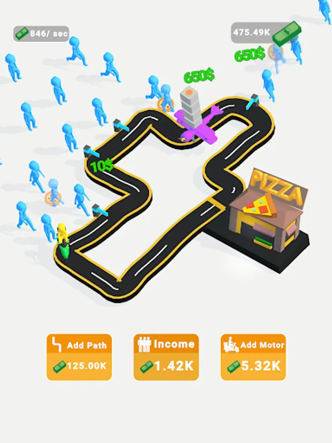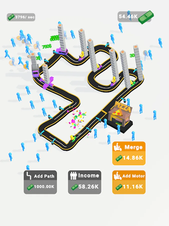 But don't be fooled by the simple gameplay - as you progress through the levels, the competition for customers will become more intense and you'll need to think strategically to stay ahead. You'll have the ability to add new motors and merge them for better performance, and expand your territory to reach more customers. And with the ability to double your earnings and revenue by clicking on the screen, you'll have the tools you need to give yourself an edge in the race.