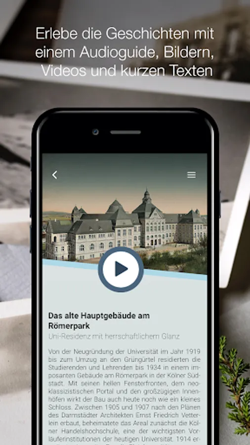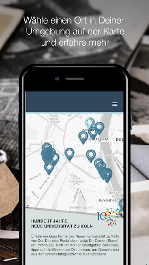 With the app "100 Years University of Cologne" you can experience stories from the history of the university on site. From the campus to the center of Cologne, you will find out more about personalities, buildings, events and perhaps one or the other curiosity from the last 100 years of the University of Cologne at almost 30 locations. Picture galleries, videos and an audio guide offer you the opportunity to discover the history of the university in an exciting way and to see one or the other, perhaps already known, place with completely different eyes.