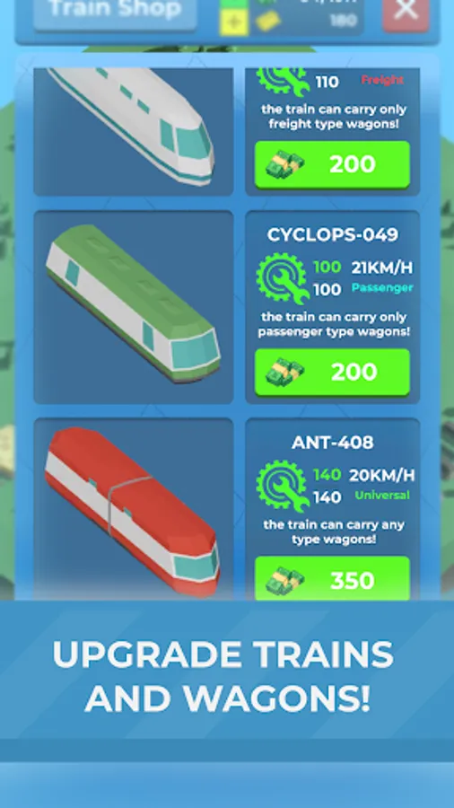 ● Upgrade trains, not everyone wants to wait a long time to become a railway tycoon, so you can improve your trains in the game. You can make the train faster, stronger, reduce station stop times, and increase the size of the wagons to sell more products.