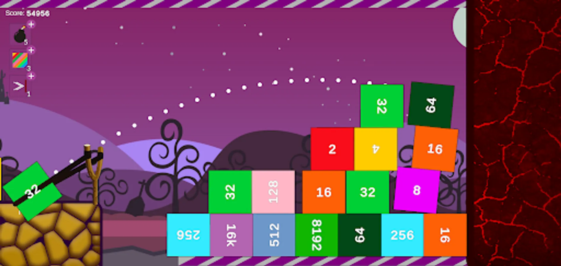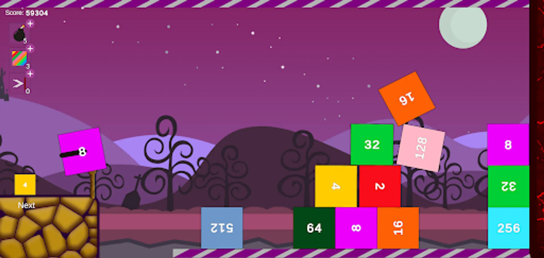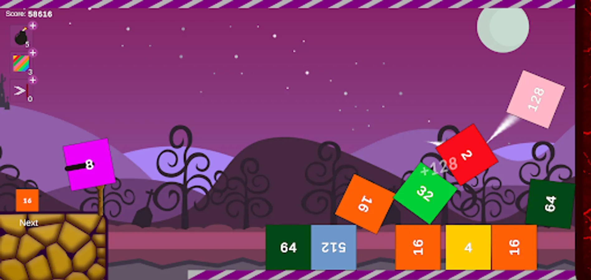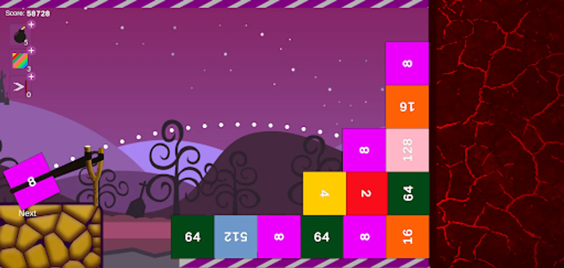 Throw and merge is a new 2048 game style fit best for time killing. Your aim is to create the biggest block ever seen. Controls are very simple, just pull the block on the slingshot and release it when you are sure it will hit a same numbered block. If you miss and do not merge the wall on the other side will push you a bit. If you miss too many times and wall pushes you to the end you will lose the game. But dont worry, because you can also use your abilities.
