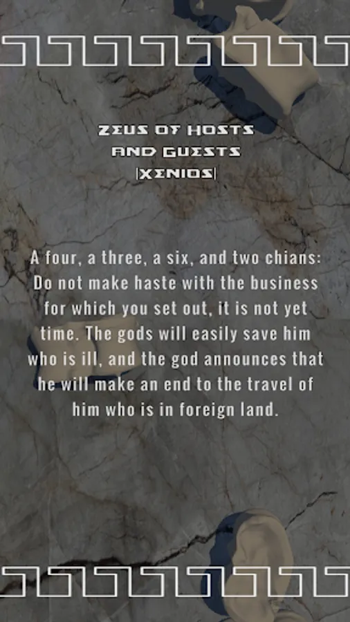 Each of the dice (or in this case, knucklebones) is worth 1, 3, 4, or 6 points. Five dice are rolled at a time and the resulting combination of values corresponds to one of 56 possible oracular sayings. Simply tap or drag across the screen to roll the bones and await your response from the oracle! Pick from one of two available themes, and be sure to ask the god your question before rolling.