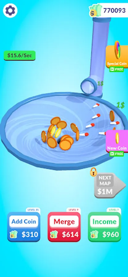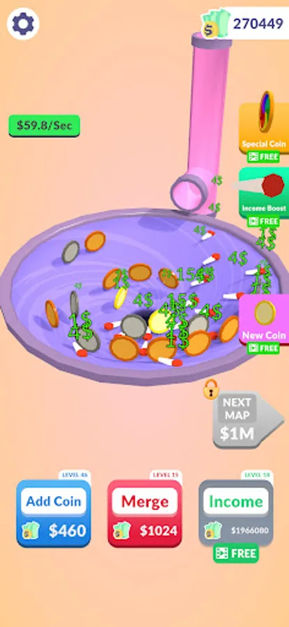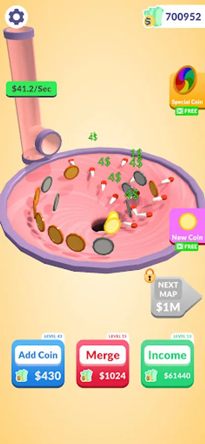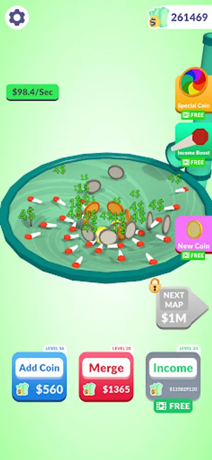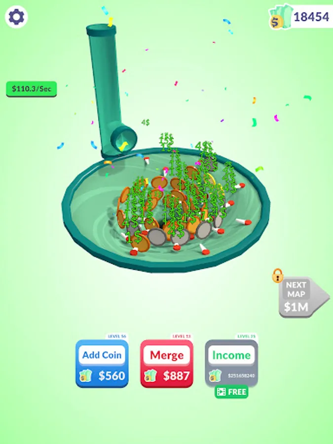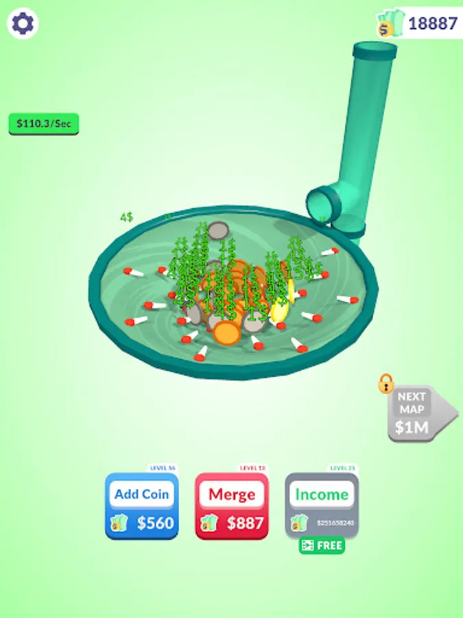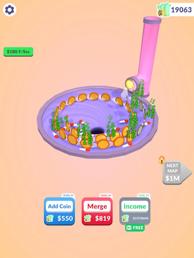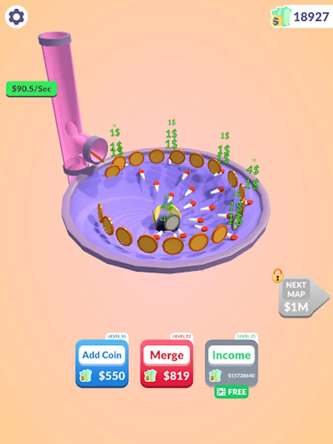 Raise your income for more coins! Watch the coins roll and go into the hole!