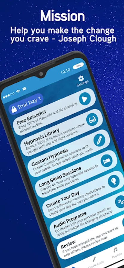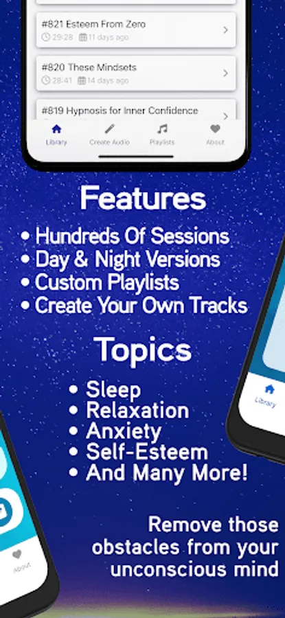 5 Star - "So much better than other hypnosis apps on the Market, this is simple and has so much choice. There's more than enough free content to keep me happy as well as paid sessions on several subjects, that cost less than my morning coffee. It's a free app, and the amount of free content makes it more than worth the download"