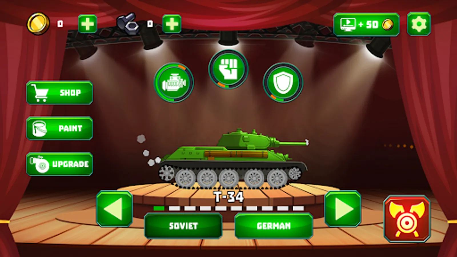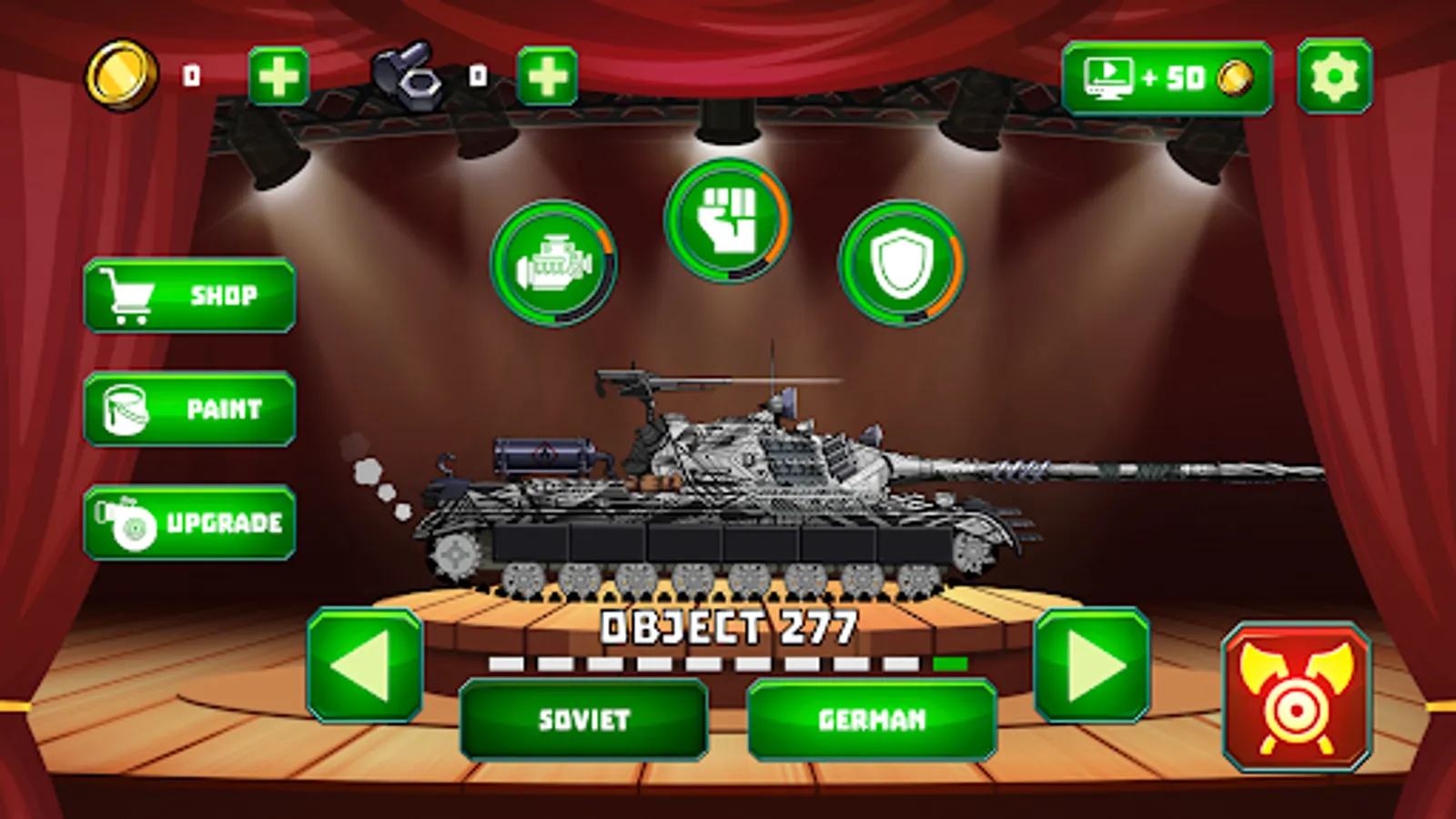 Your main goal is to prepare for the boss fight. Buy new tanks and upgrade them with coins and parts collected in battle. Don't forget to repaint your tank to match the terrain in which the battle will take place.