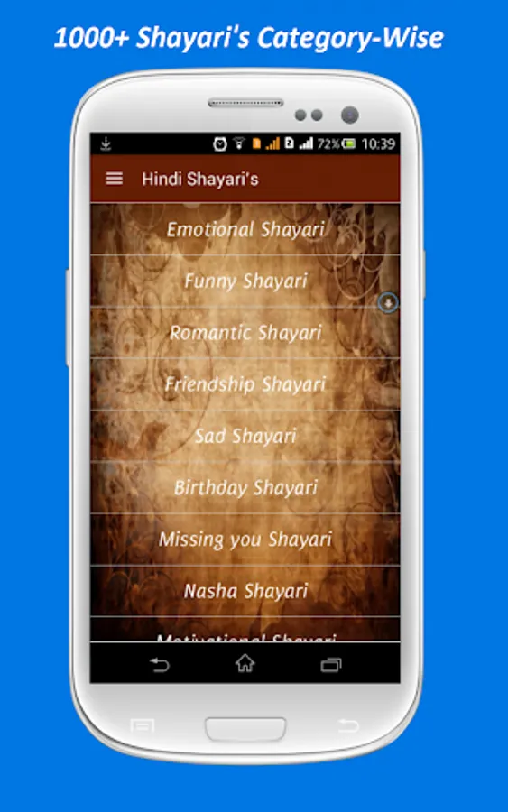Hindi Shayari app, Love Shayari, Sad, Shayari, Gujarati Shayari, Best Shayari's,Friendship Shayari, Romantic View Best Shayari, whatsapp status and many more daily updated hindi shayari app
