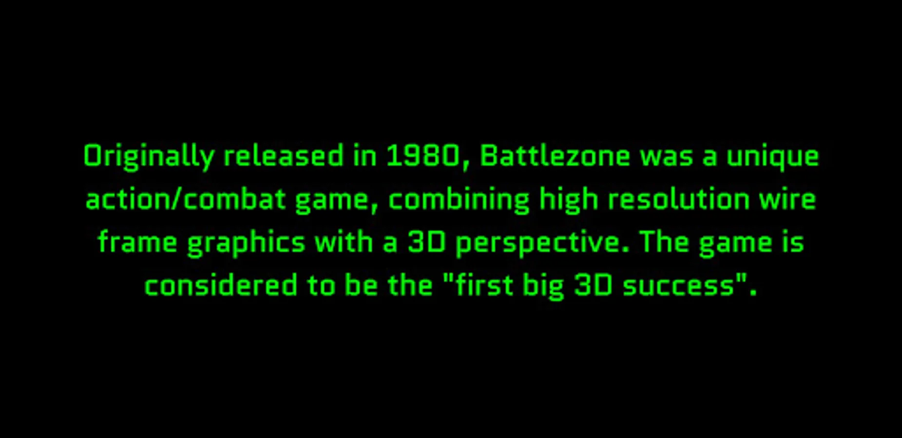 Originally released in 1980, Battlezone was a unique action/combat game, combining high resolution wire frame graphics with a 3D perspective. The game is considered to be the "first big 3D success".