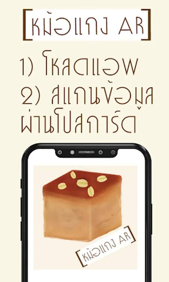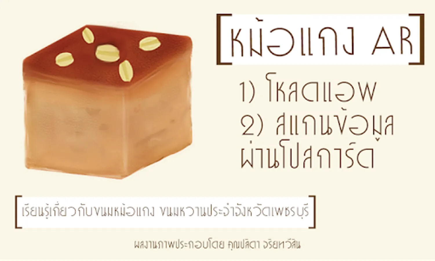 Learn this information from the postcard of Kanom Mo Kaeng, Phetchaburi, using Augmented Reality (AR) technology which is a modern innovation. Just load the application "AR curry" installed on your smartphone. Then use an application to scan through the postcard.