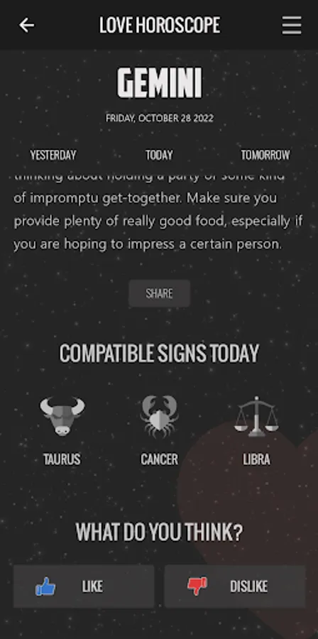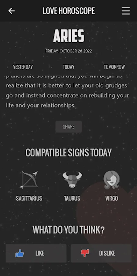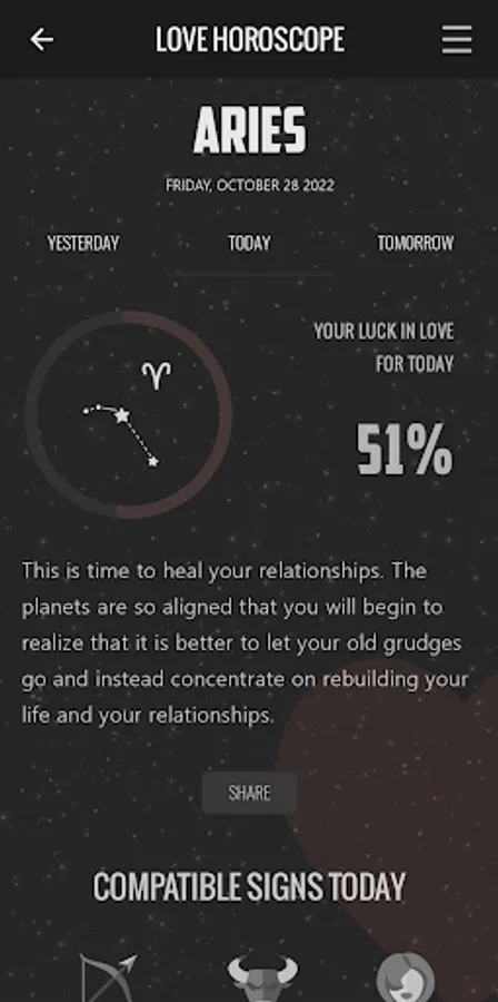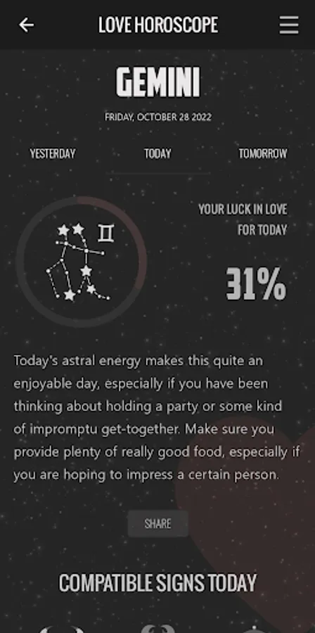 - Possibility of sharing your Love Horoscope on social networks.