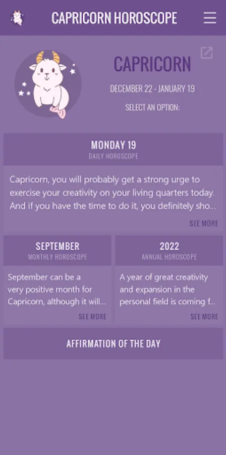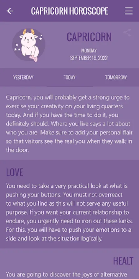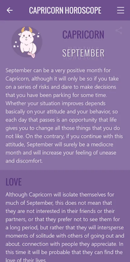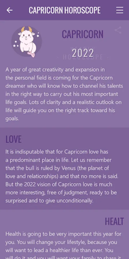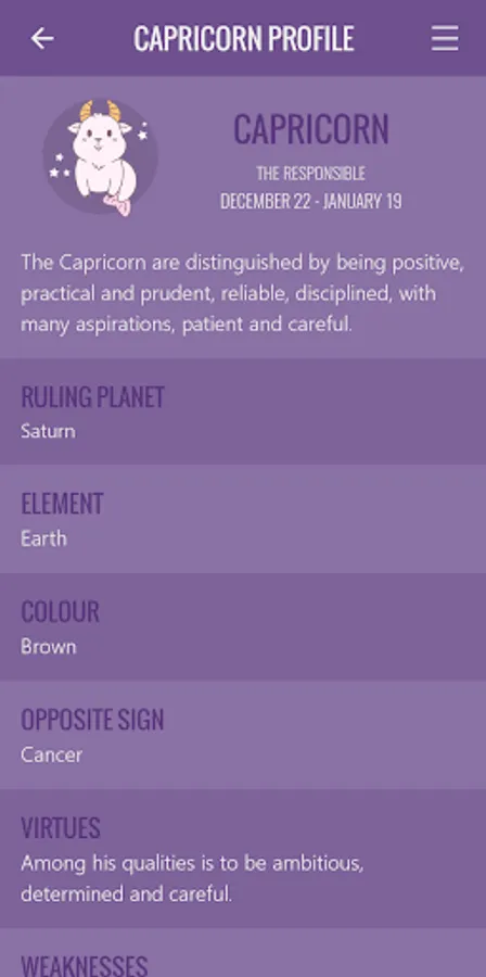 The application is completely intuitive, besides having a soft and sweet design without losing its formal design. Fulfills its purpose 100%: provide your daily horoscope for Capricorn sign everyday for free in the comfort of your Android device.