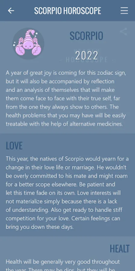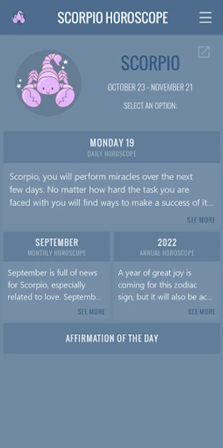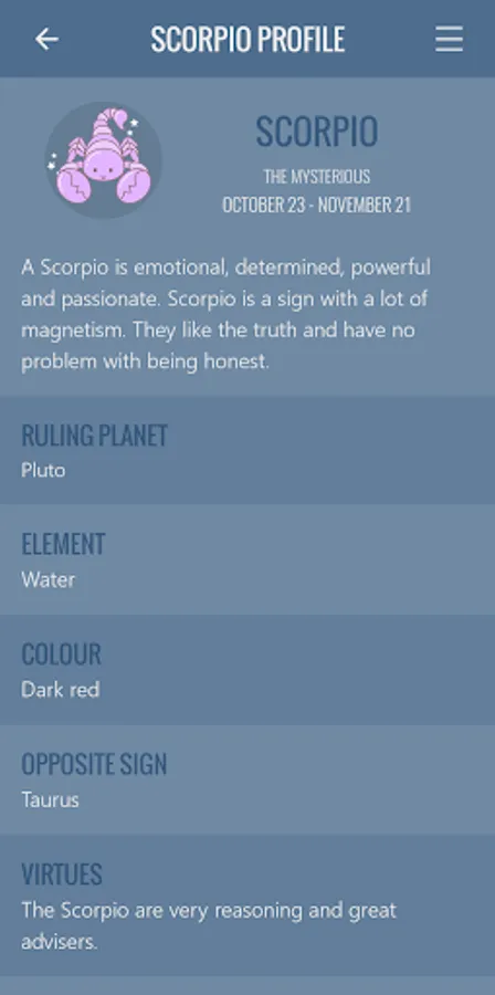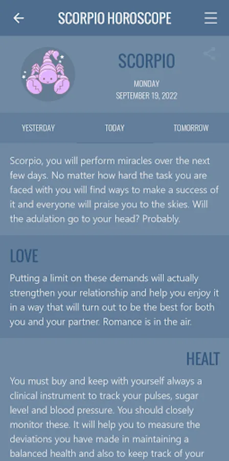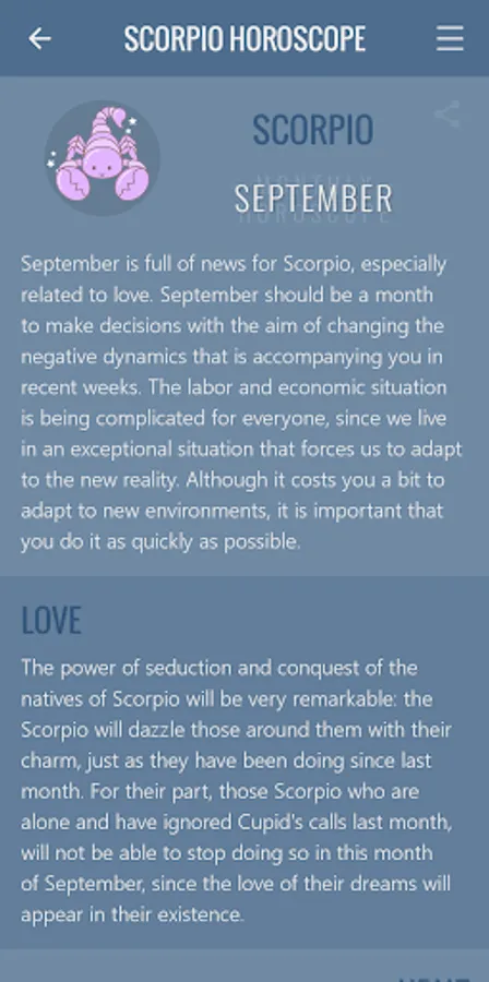 The application is completely intuitive, besides having a soft and sweet design without losing its formal design. Fulfills its purpose 100%: provide your daily horoscope for Scorpio sign everyday for free in the comfort of your Android device.