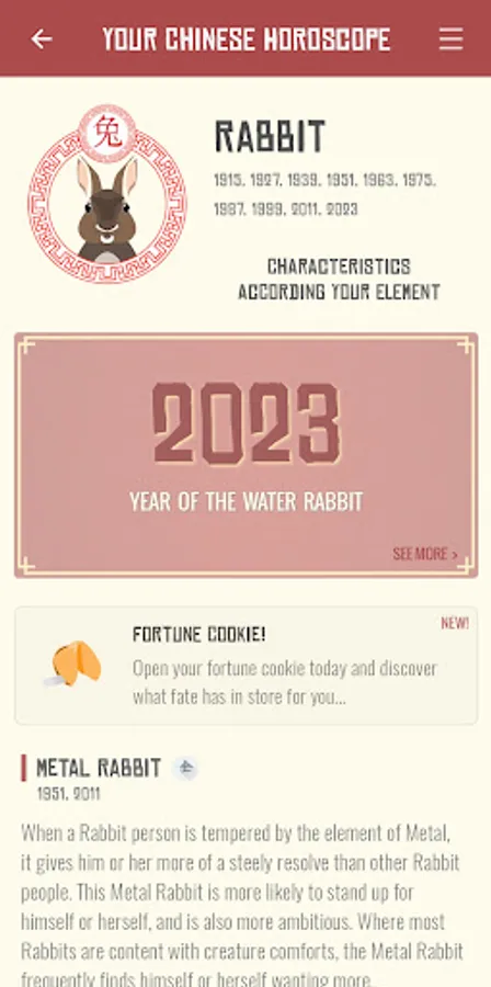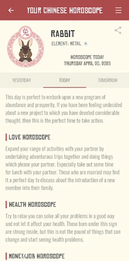 Your Chinese Horoscope is a free application that offers you the facility to check the predictions for your Chinese Zodiac sign every day quickly and easily on your Android device.