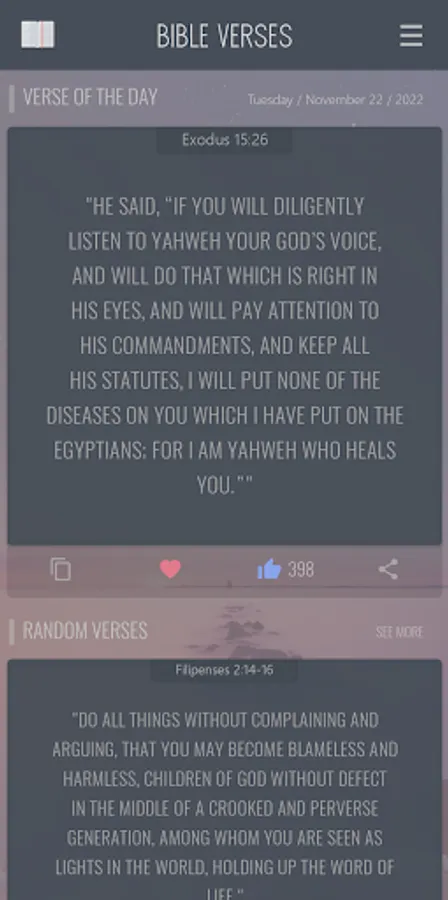 Download Verse of the Day and start receiving verses and passages from the Bible every day, with the possibility of sharing on your social networks. For free and without internet connection.